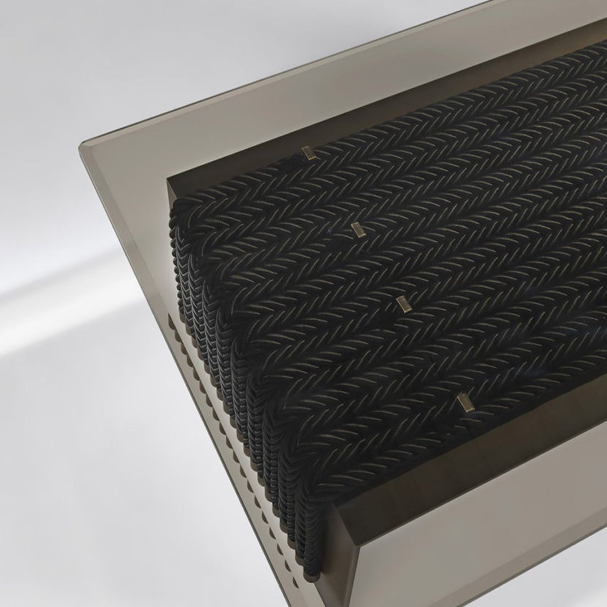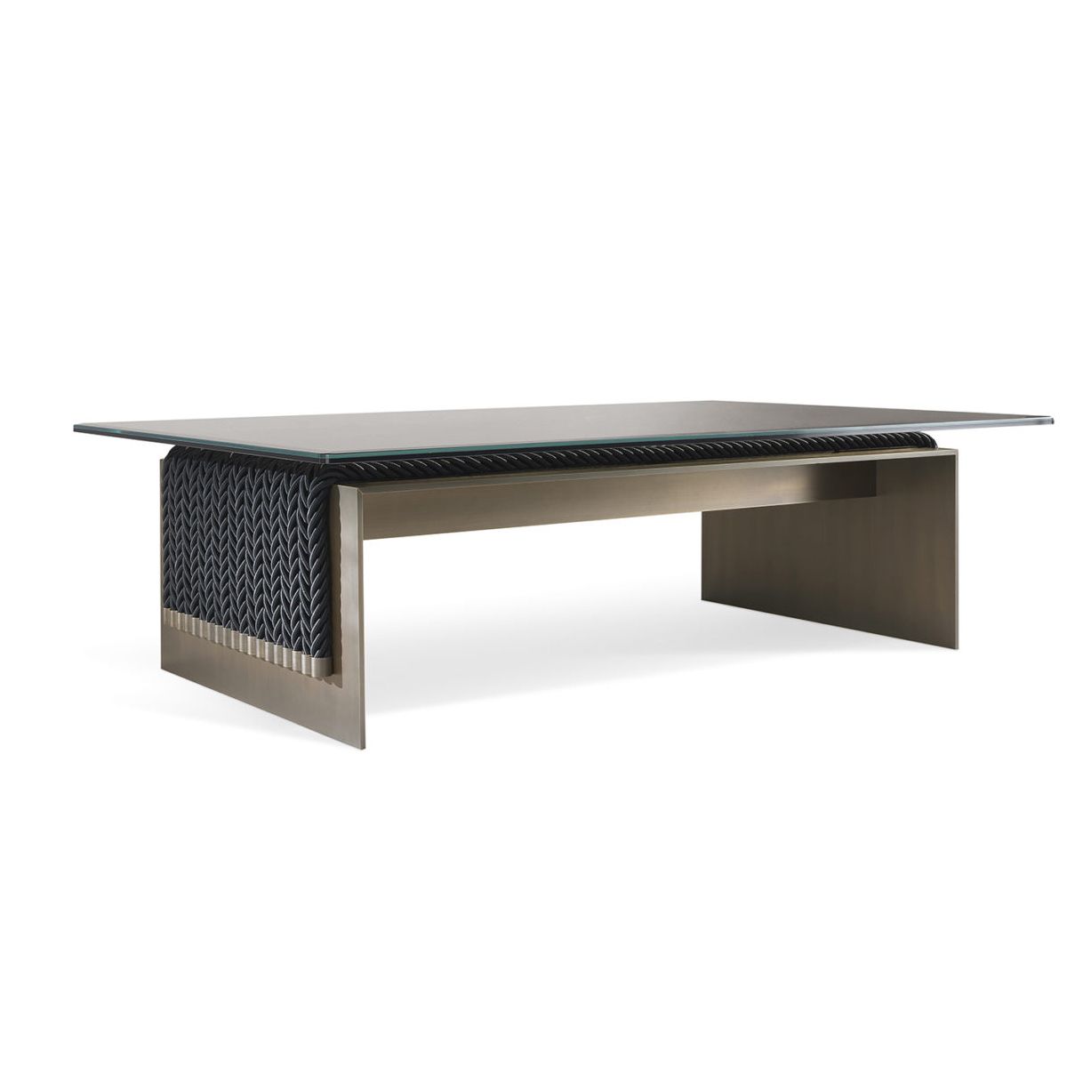 Центральный стол, сочетающий в себе простоту современного дизайна и сложное производство: металлическая конструкция толщиной 10 мм выдерживает вес консоли. Предмет обогащен декоративными канатами, проходящими по внешнему периметру. Структура из металла с бронзовой отделкой. Столешница – двойное стекло (прозрачное и бронзовое). Детали в бронзовой отделке.