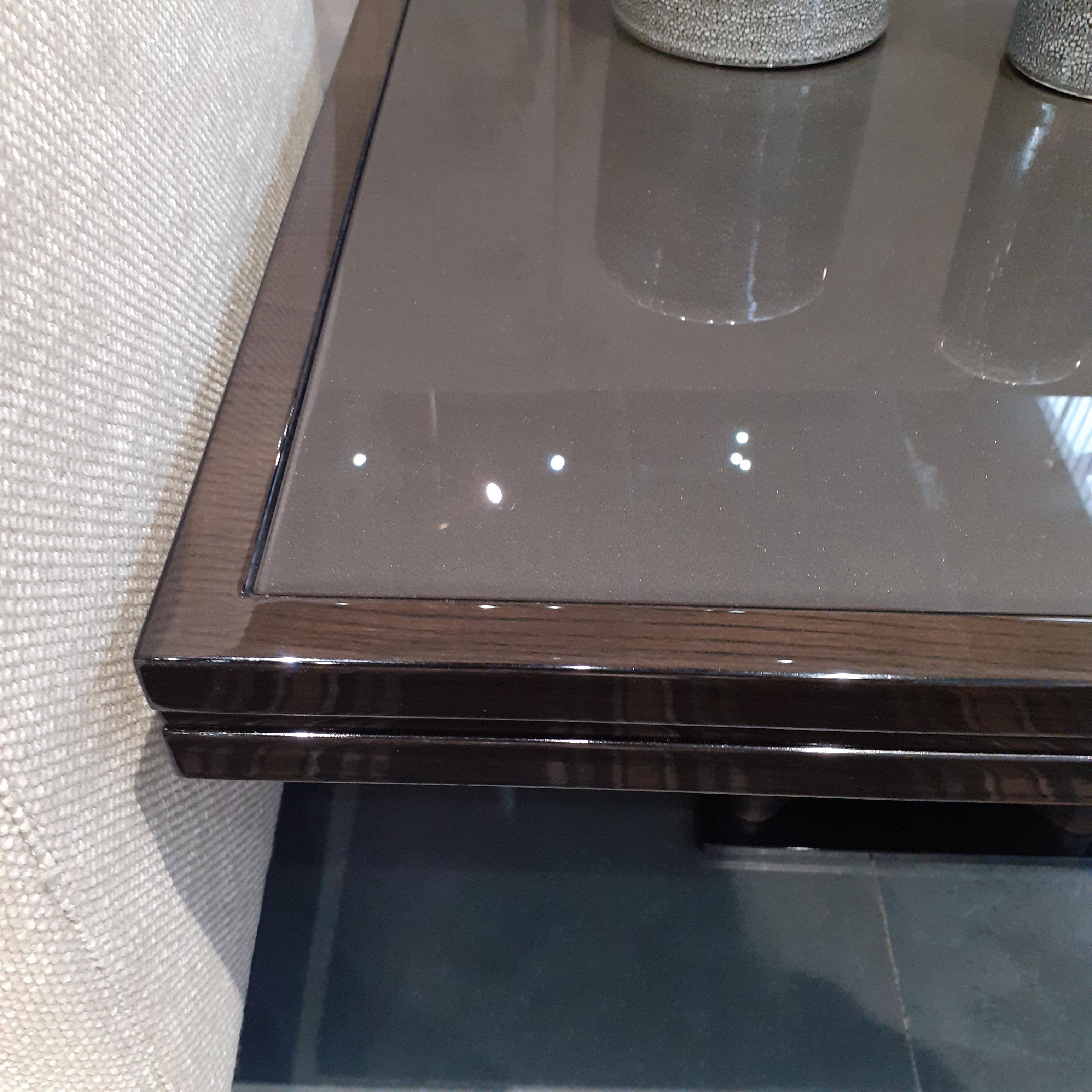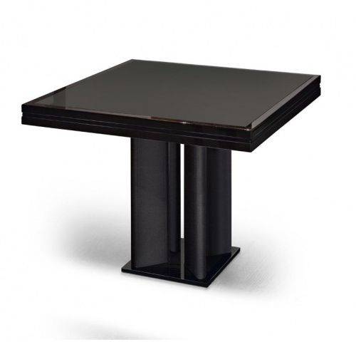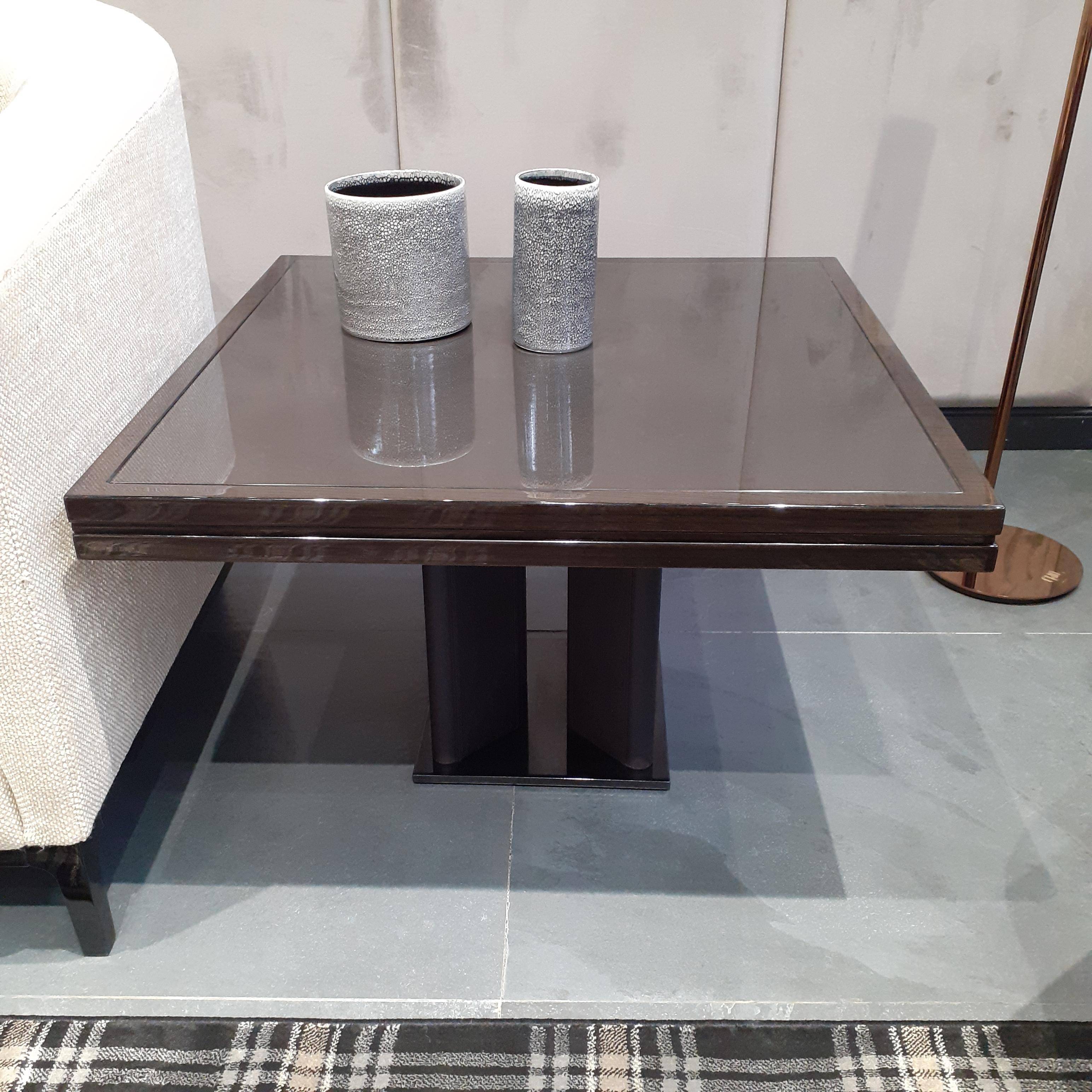 Кофейный столик выполнен из дерева в оттенке каштан.  Ножки обтянуты кожей. Основание из металла с отделкой черный хром. Материалы столешницы: дерево или стекло. Длина: 70 см, высота: 54 см.