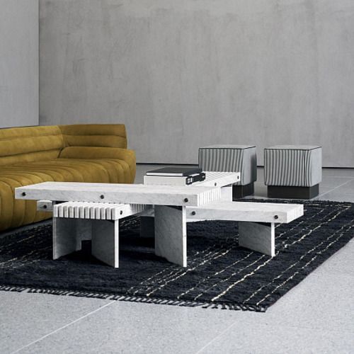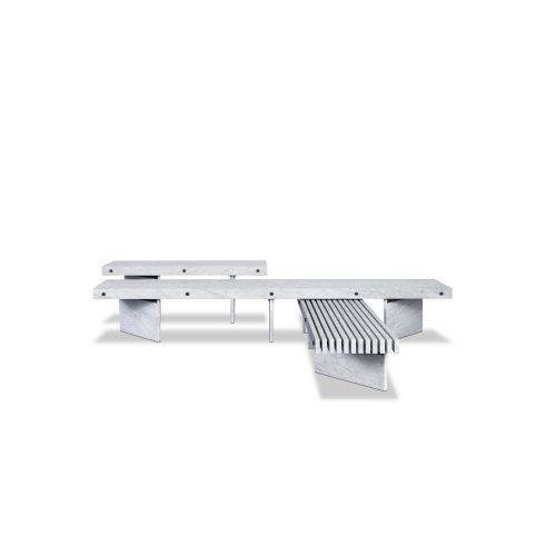 Модульный прикроватный столик Rail. Мраморные ножки соединены сверху с помощью соединений из полированной латуни. Верх составлен полосами из мрамора толщиной 2 см, высотой 6 см, соединенными балками из полированной латуни. Столешница доступна в мраморе Bianco Gioia.