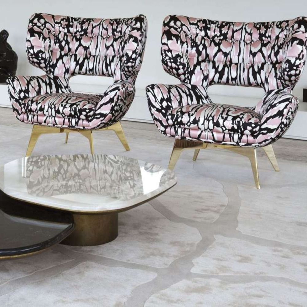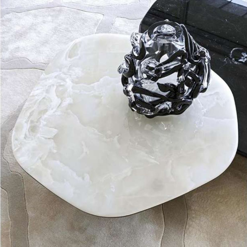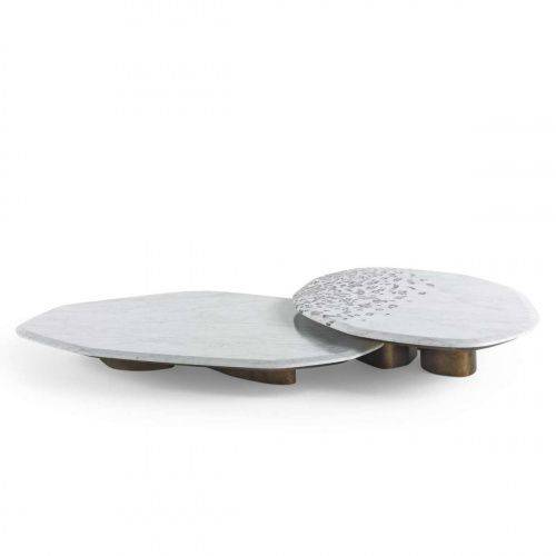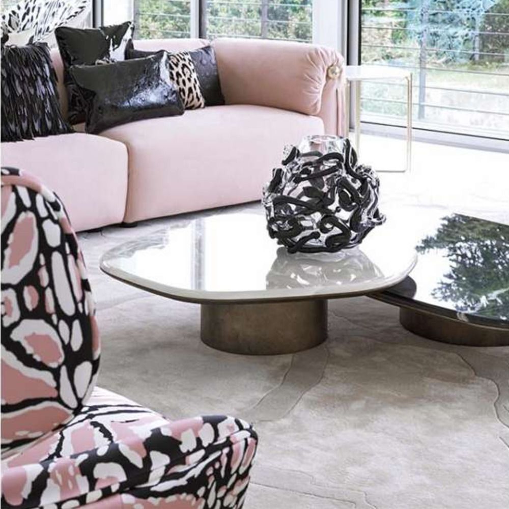 Верх стола сделан из мрамора из коллекции с матовой отделкой. Топ из оникса по запросу. Центральный стол с деревянным основанием, лакированный в античной бронзовой отделке. Логотип RC изготовлен из литой латуни с отделкой из платины или золота.