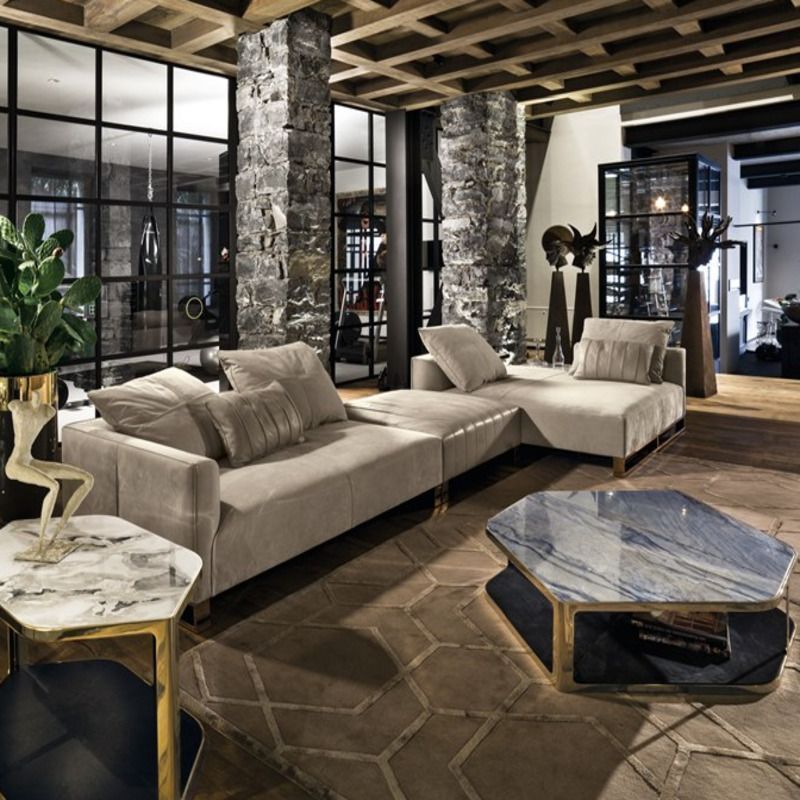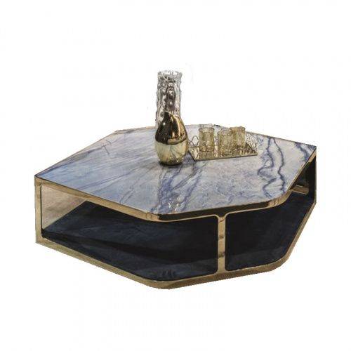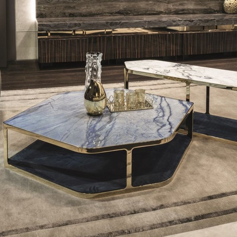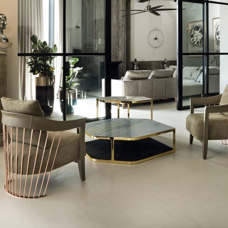 Структура из шлифованной стали с лазерной резкой. Столешница выполнена из мрамора. Основание обито натуральной кожей.