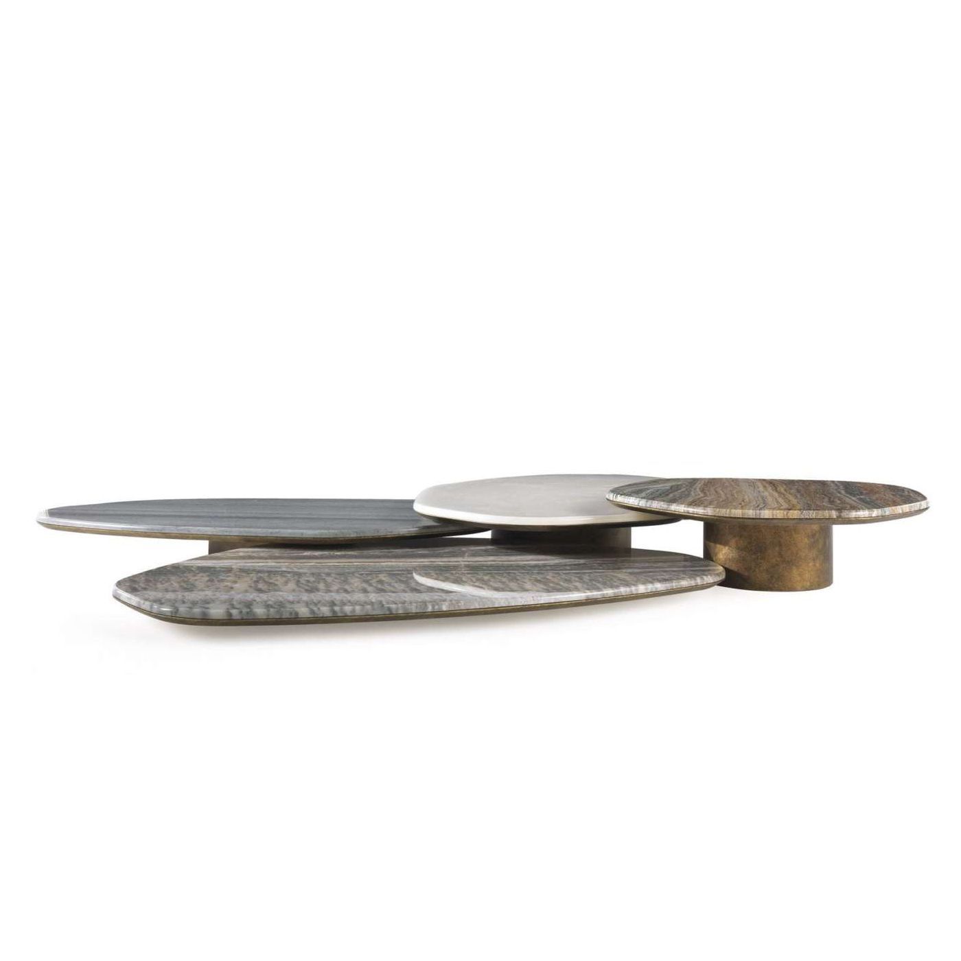Яркий стол с сильным сценографическим воздействием. Композиция, созданная из асимметричных вершин разных сортов и оттенков мрамора и оникса, напоминает о нерегулярной красоте природы. Верх из мрамора из коллекции. Топ из оникса по запросу. Деревянная основа, покрытая лакированной античной бронзой. Логотип RC из литой латуни с отделкой из платины или золота.