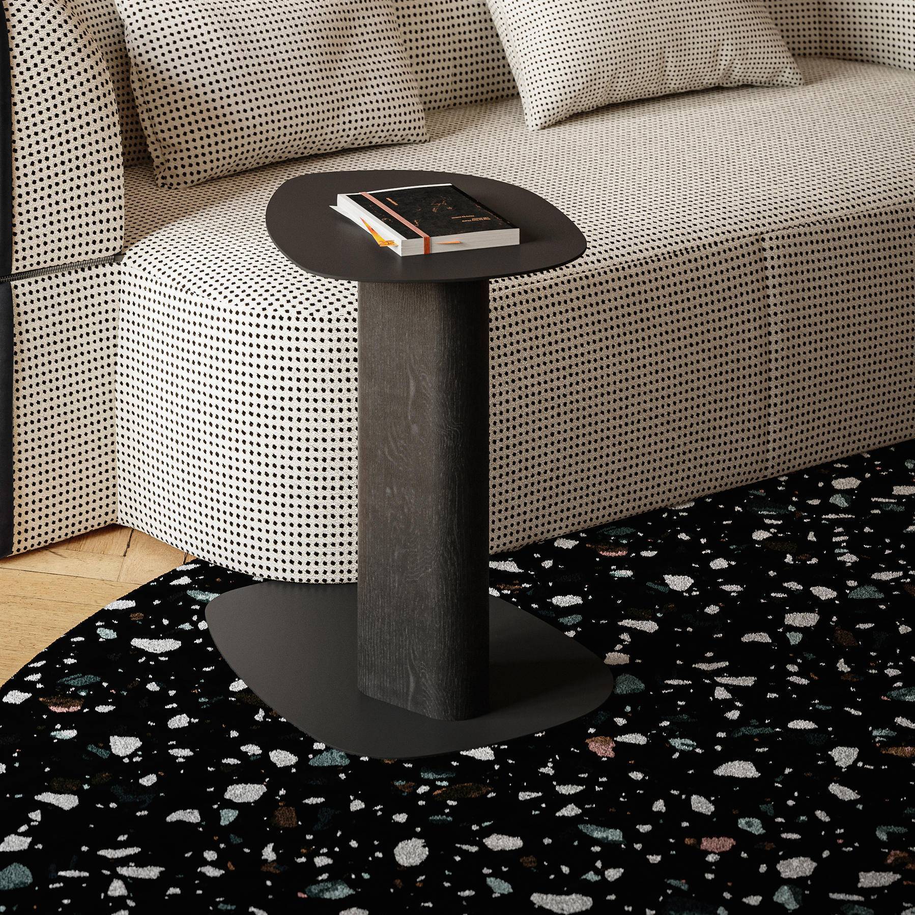 Приставной столик с полками из стали в черной отделке и основанием из карбонизированного (темного) или натурального (светлого) ясеня.