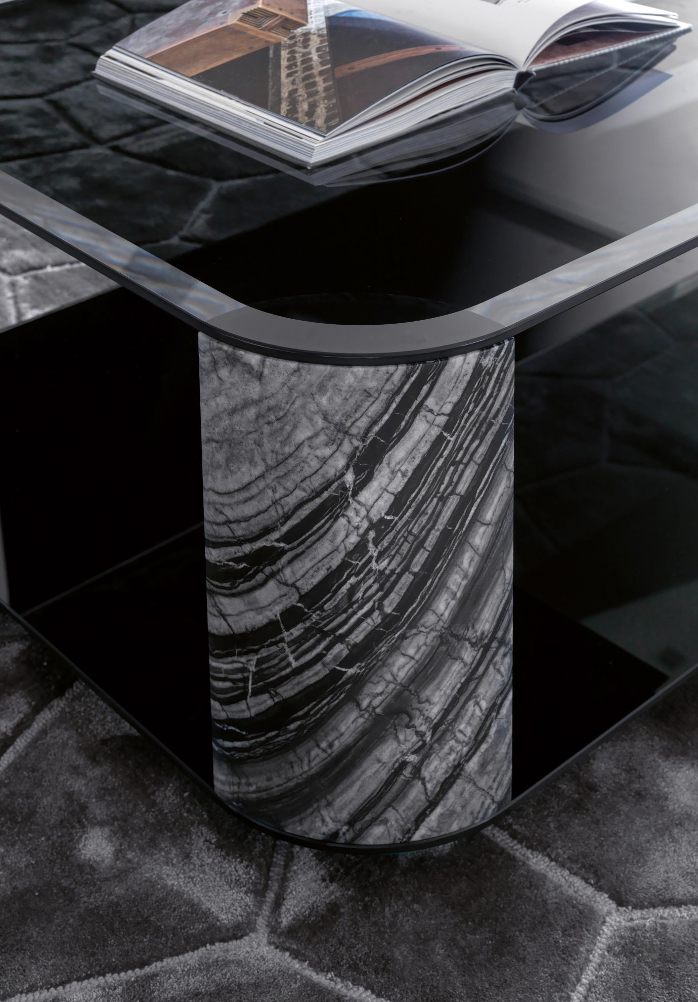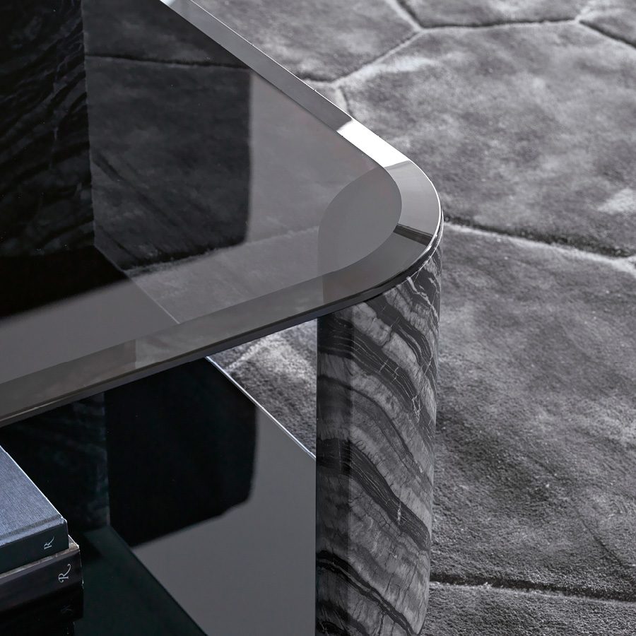 Гармоничное сочетание дымчатого стекла и глубокого черного мрамора подчеркивает утонченную эстетику столика.