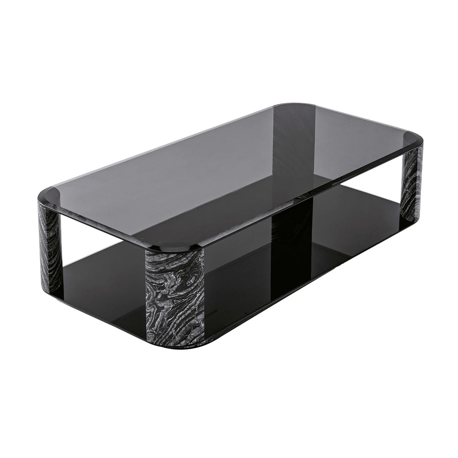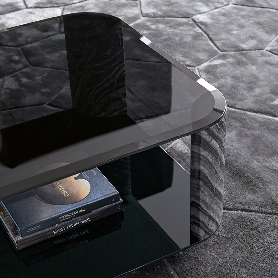 Глубокий черный оттенок мрамора эффектно контрастирует с дымчатым стеклом, создавая выразительный и стильный визуальный образ.
