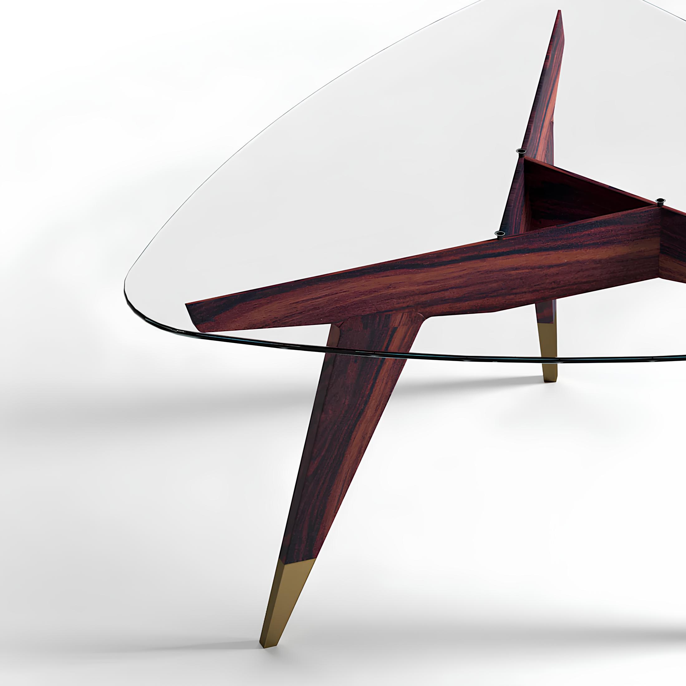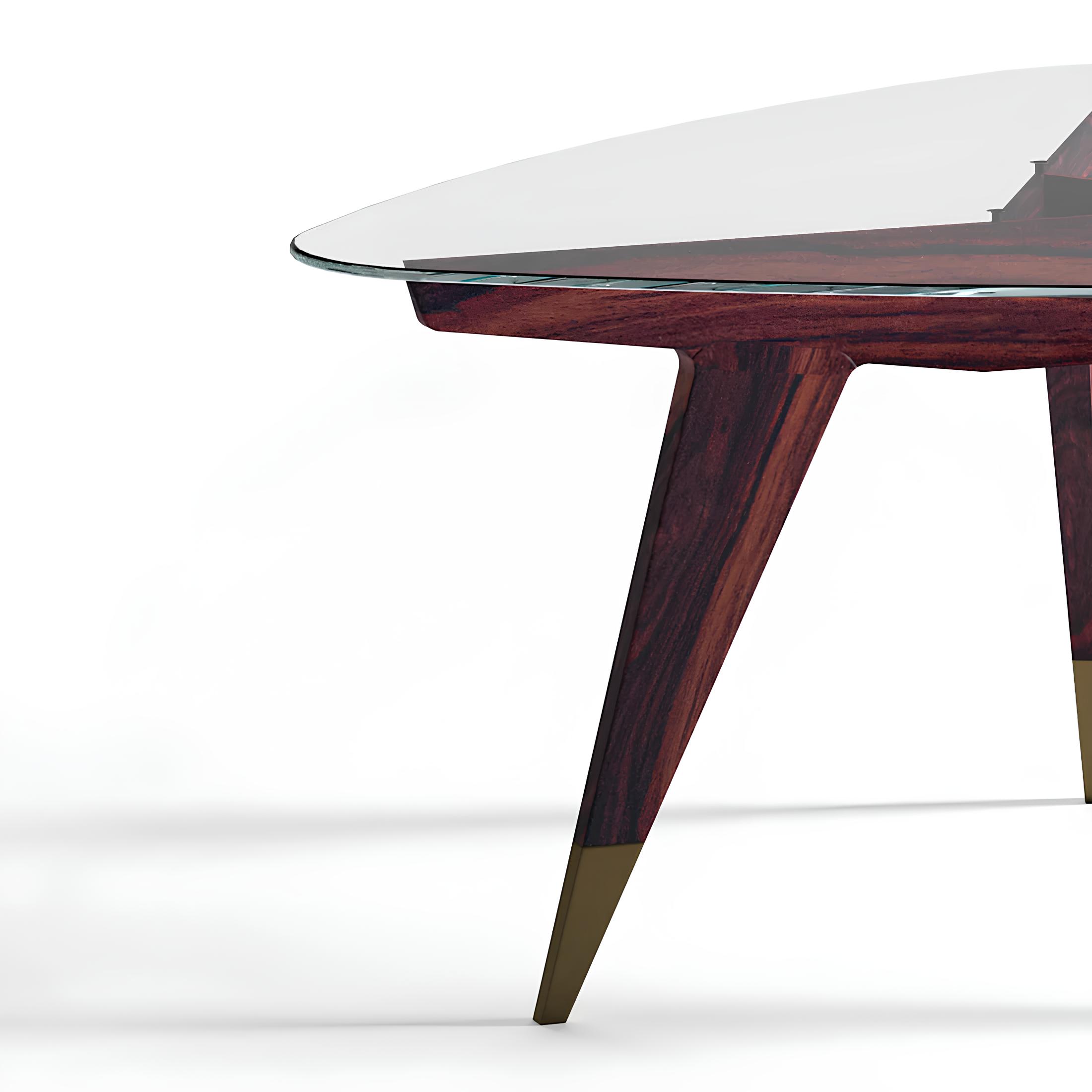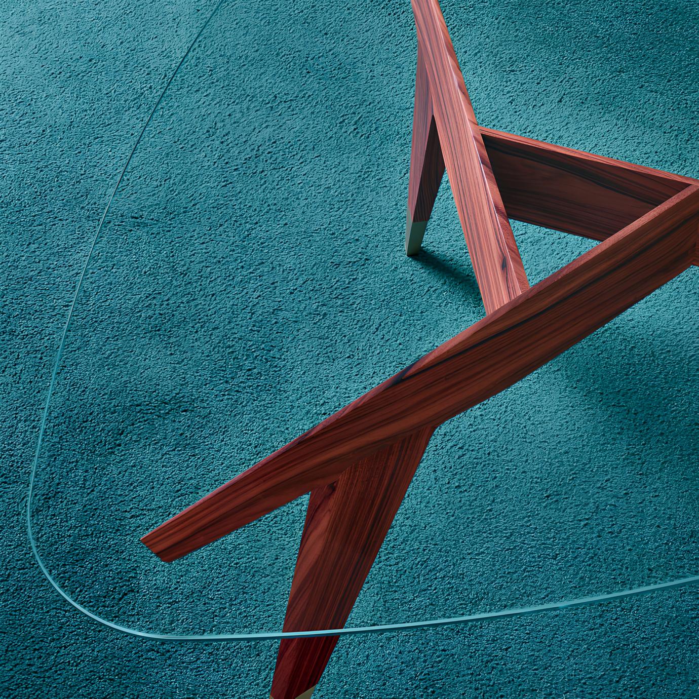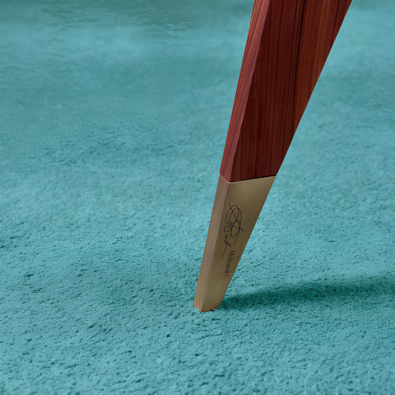 Каркас из массивного палисандра отличается изысканной выразительностью древесного рисунка и мастерски выверенными соединениями. Ножки из сатинированной латуни, расставленные под особым углом, создают визуально «акробатичную» опору — точный расчёт и дизайнерская хореография в чистом виде.