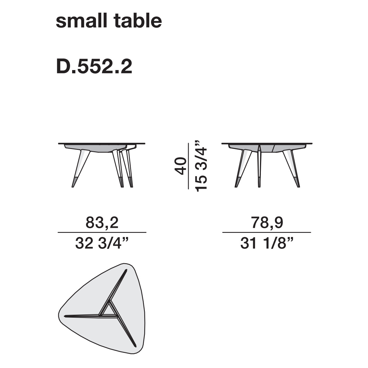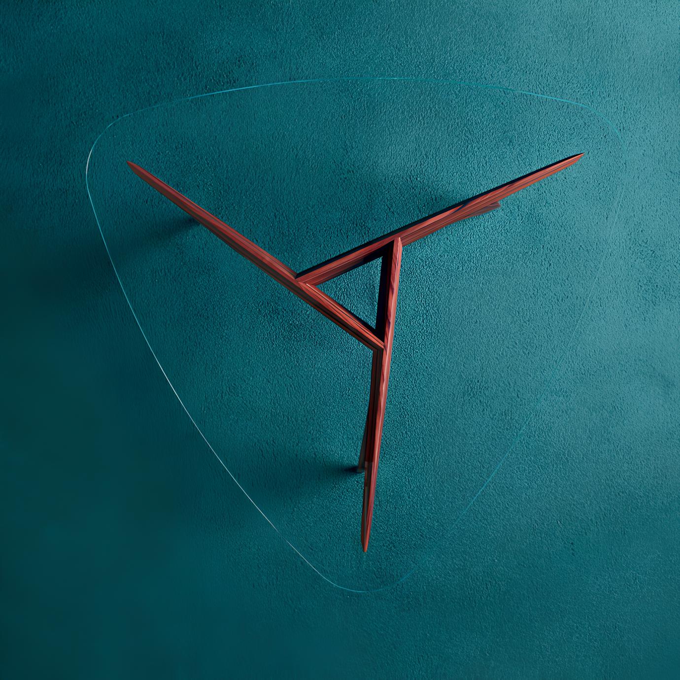 Дизайн D.552.2 отражает стремление к визуальной лёгкости и идеальному балансу форм. Тонкая треугольная столешница из ультрапрозрачного закалённого стекла как будто парит в воздухе, подчёркивая изящность конструкции и создавая ощущение невесомости в интерьере.