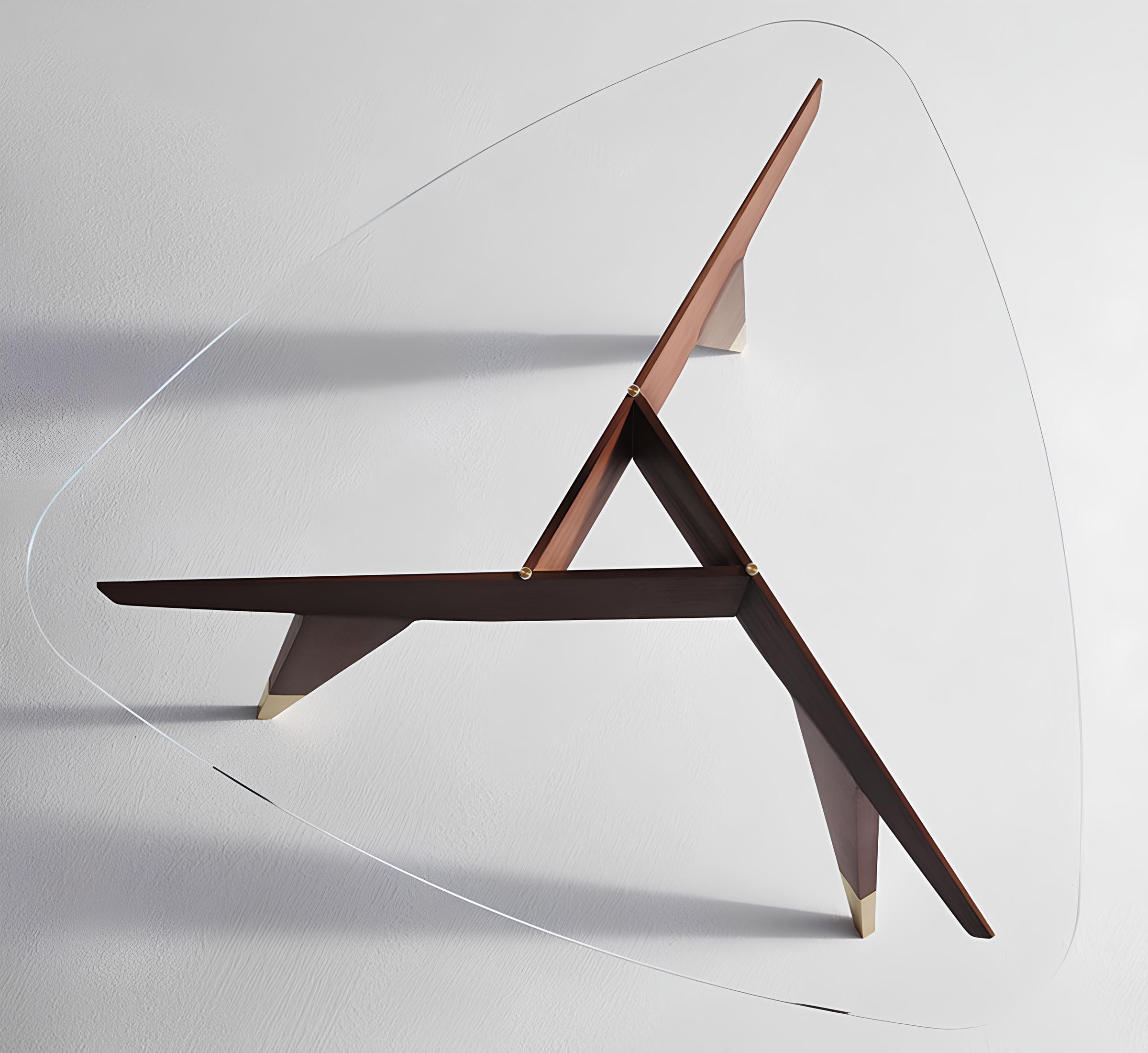Треугольная столешница изготовлена из ультрапрозрачного закалённого стекла с плавно закруглёнными углами — кристальная чистота без малейшего зелёного оттенка, создающая эффект почти невесомой прозрачности.
