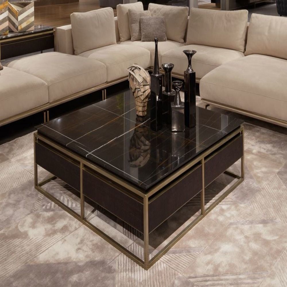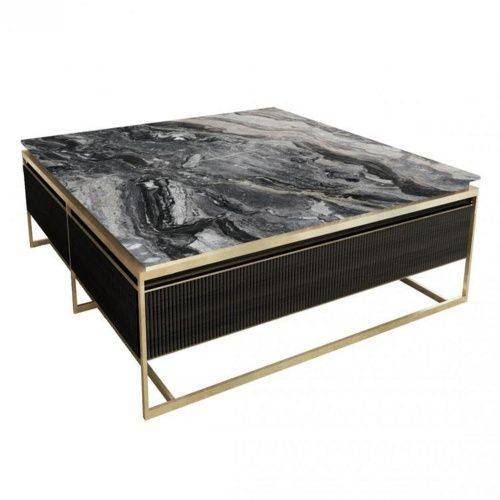 Стол с 4-мя ящиками выполнен из шпонированной древесины и украшен резным барельефом в виде вертикальных профилей. Топ из мрамора Sahara noir, имеется дополнительная полка из дымчатого стекла. Внутренняя поверхность ящиков отделана микрофиброй. Основание из сатинированной стали.