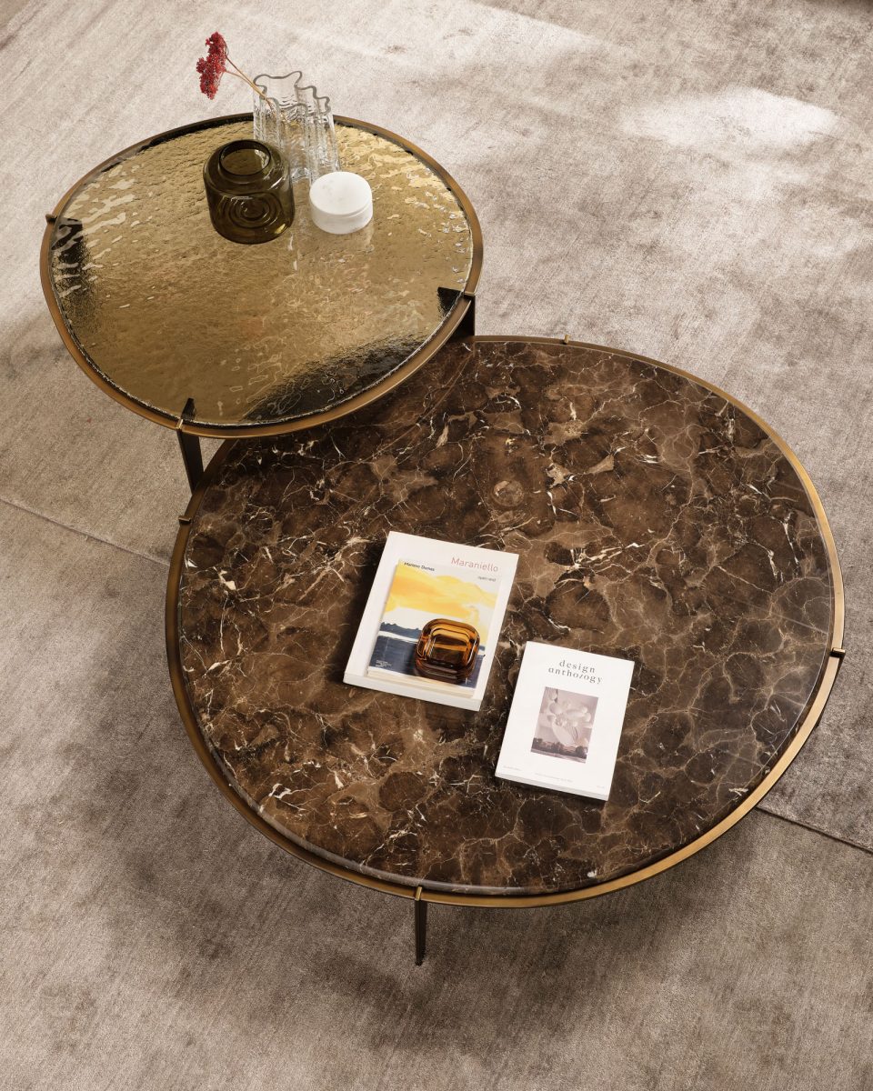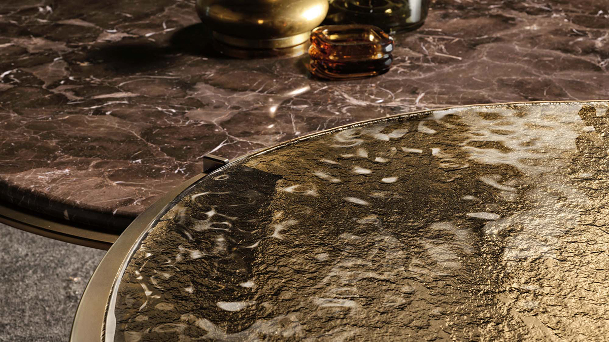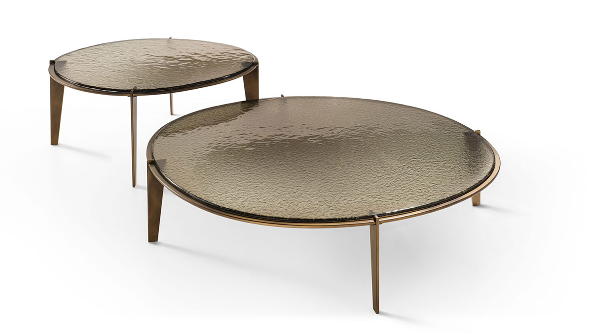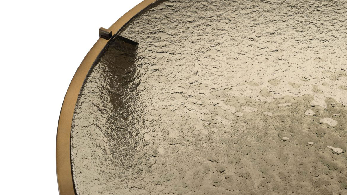 Журнальный столик со столешницей из плавленого и закаленного стекла толщиной 10 мм, с дымчатой или бронзовой отделкой. Столешница также может быть выполнена из мрамора. Металлическое основание из полированной латуни.