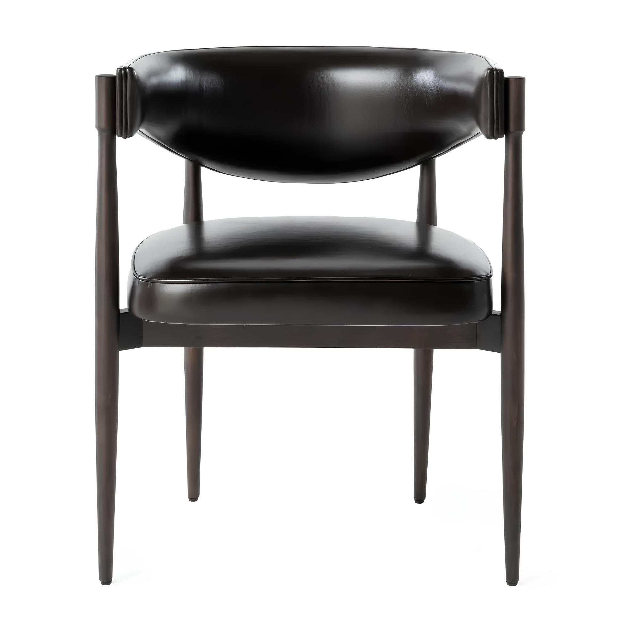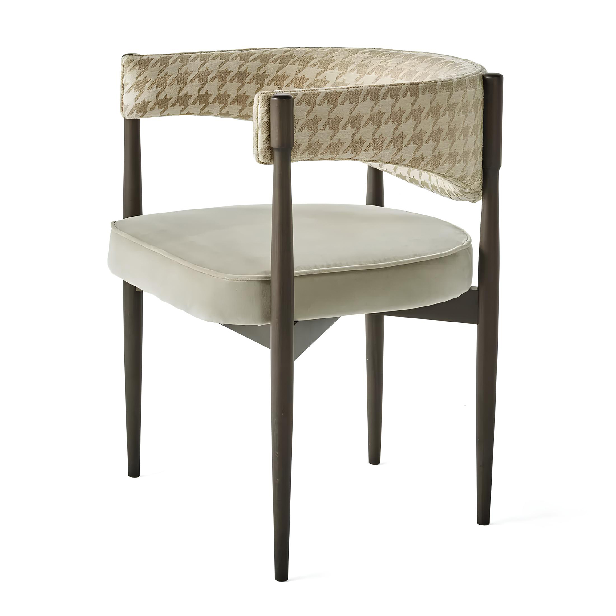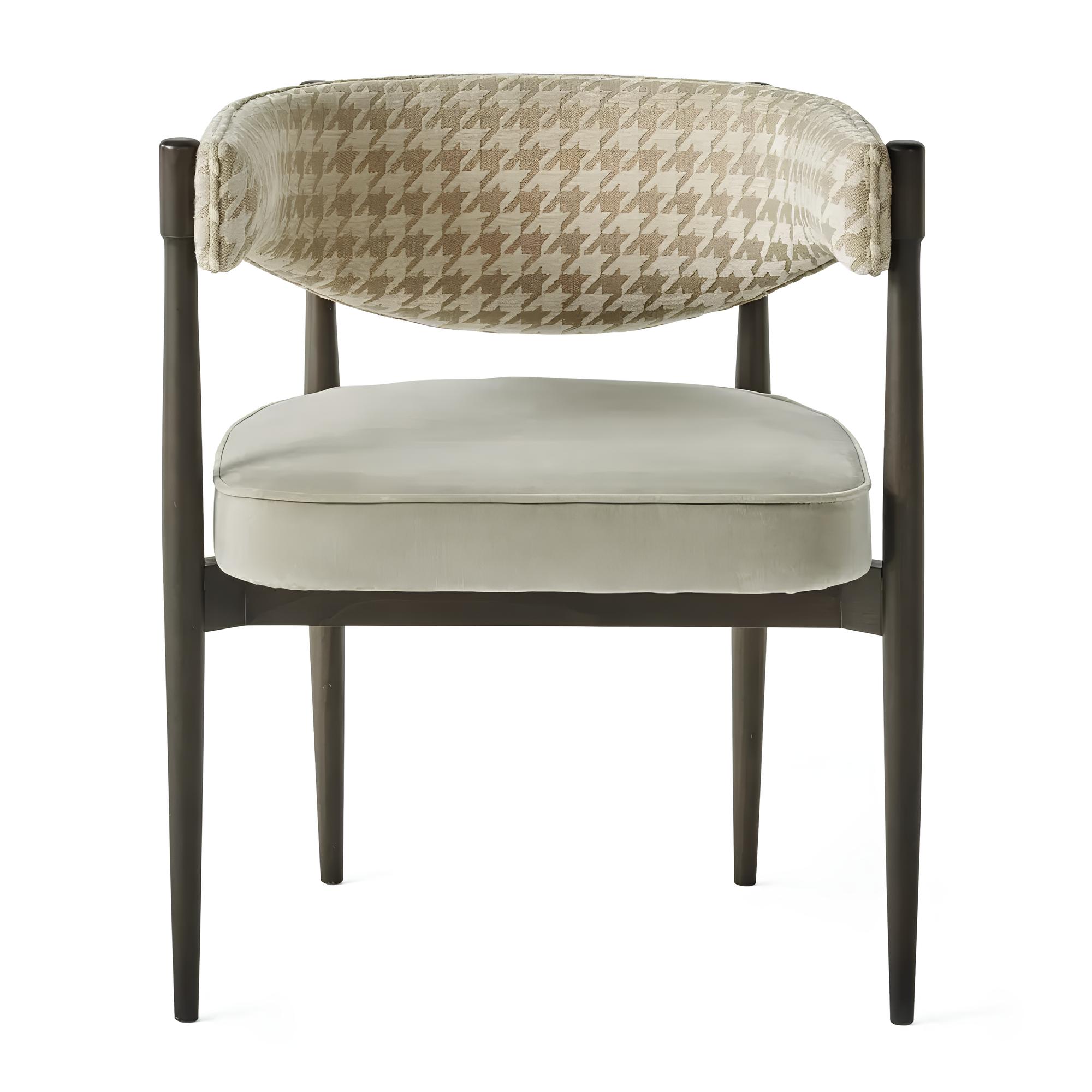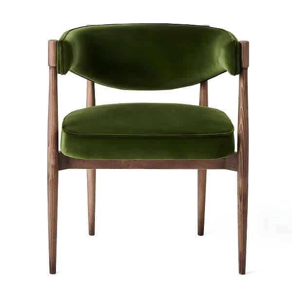 Слегка сужающиеся ножки и спинка с плавным изгибом формируют утончённый силуэт. Подлокотники подчёркивают комфорт и придают креслу статусность, а обивка из ткани или кожи из коллекции бренда усиливает его современный характер.