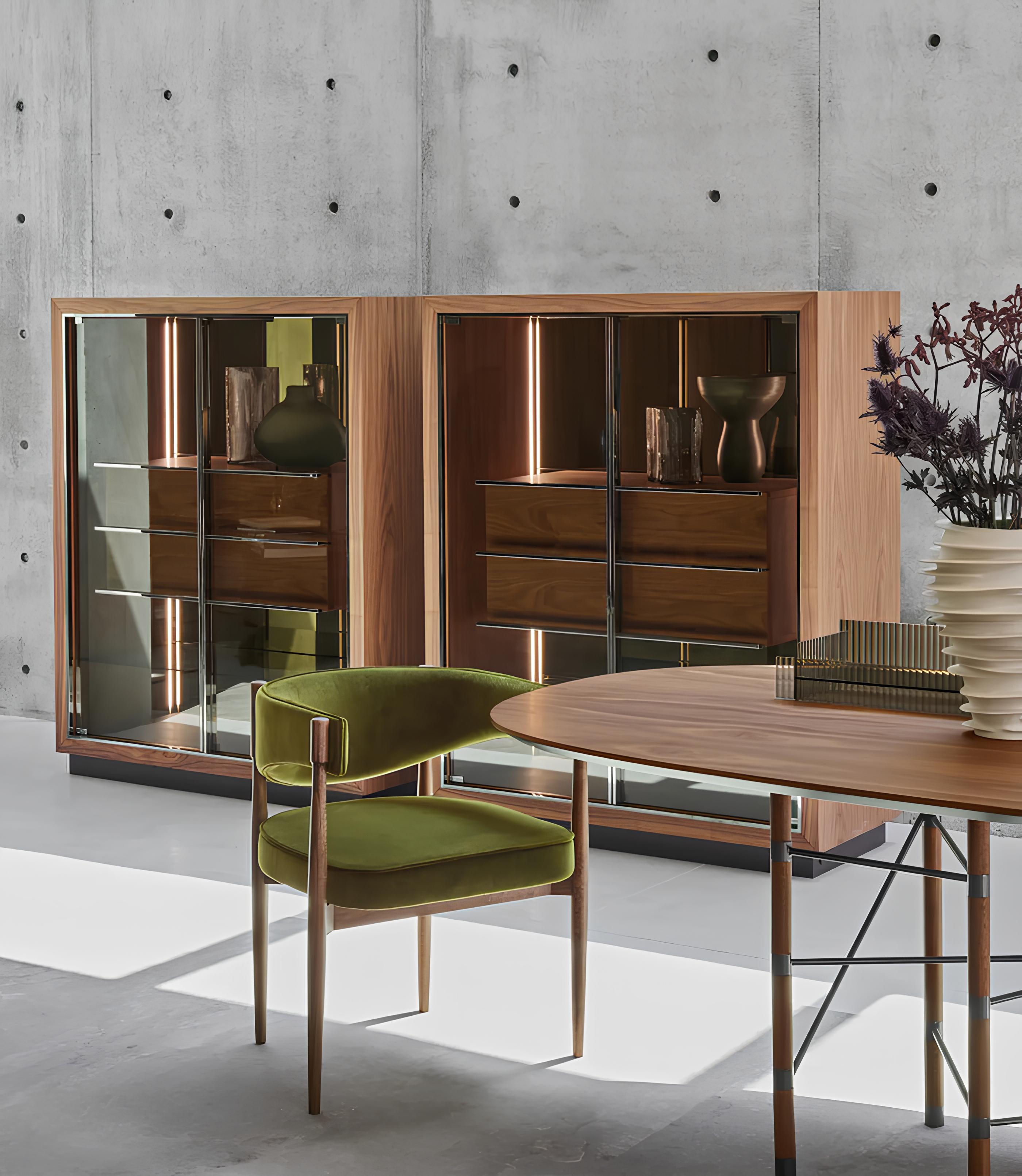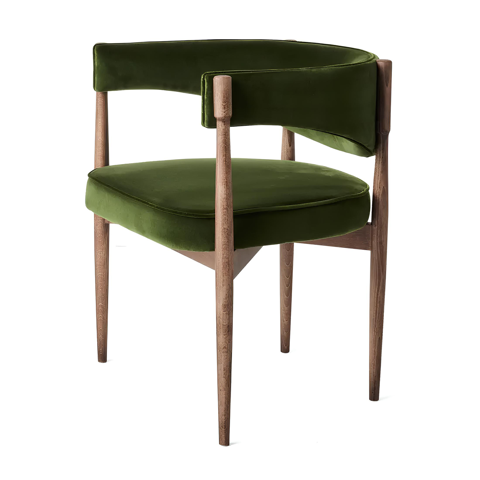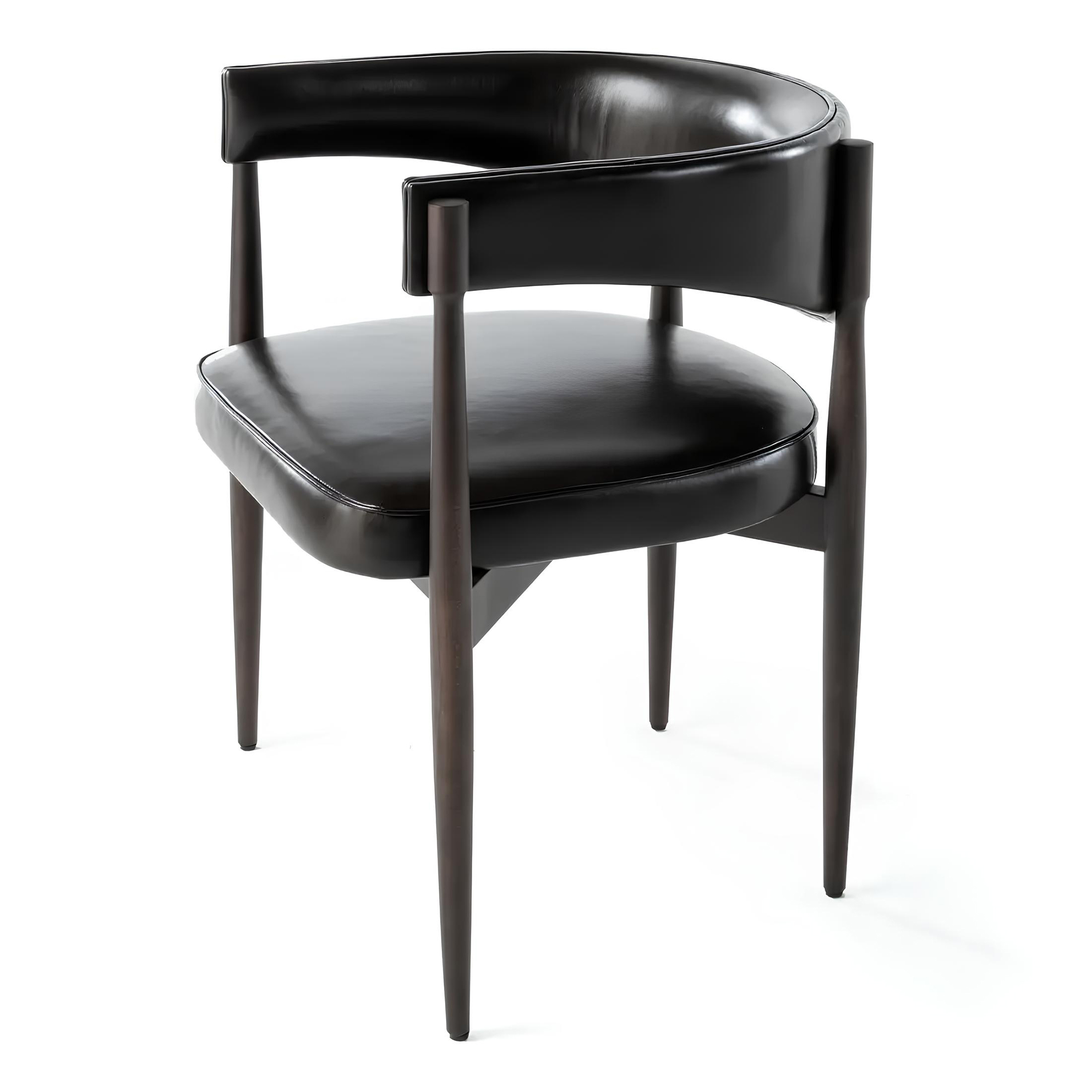 Слегка сужающиеся ножки и спинка с плавным изгибом формируют утончённый силуэт. Подлокотники подчёркивают комфорт и придают креслу статусность, а обивка из ткани или кожи из коллекции бренда усиливает его современный характер.