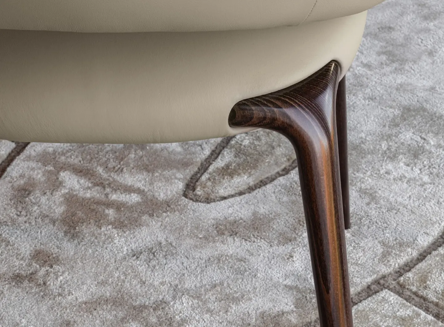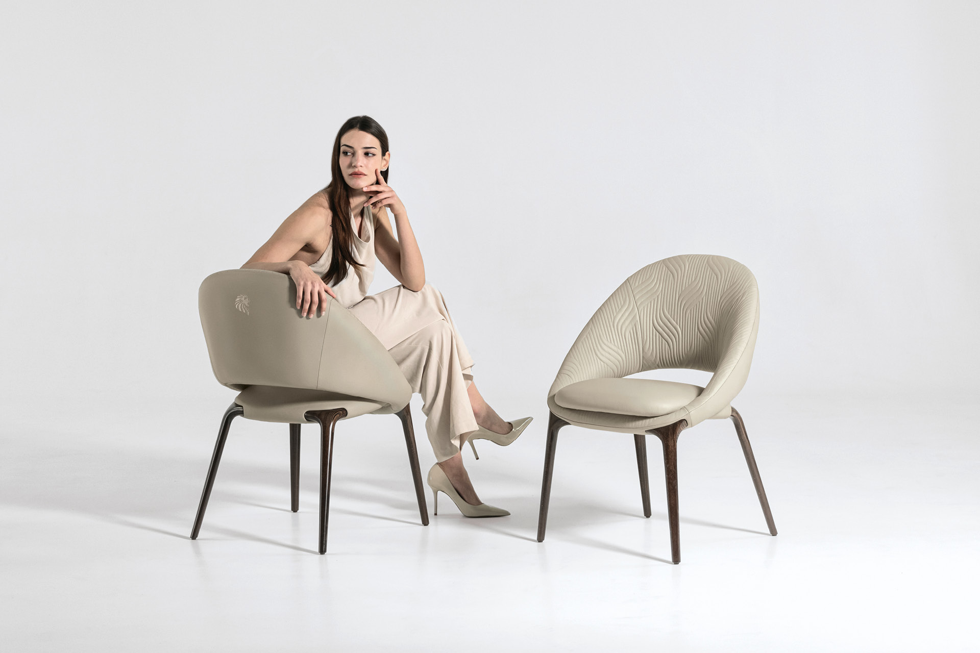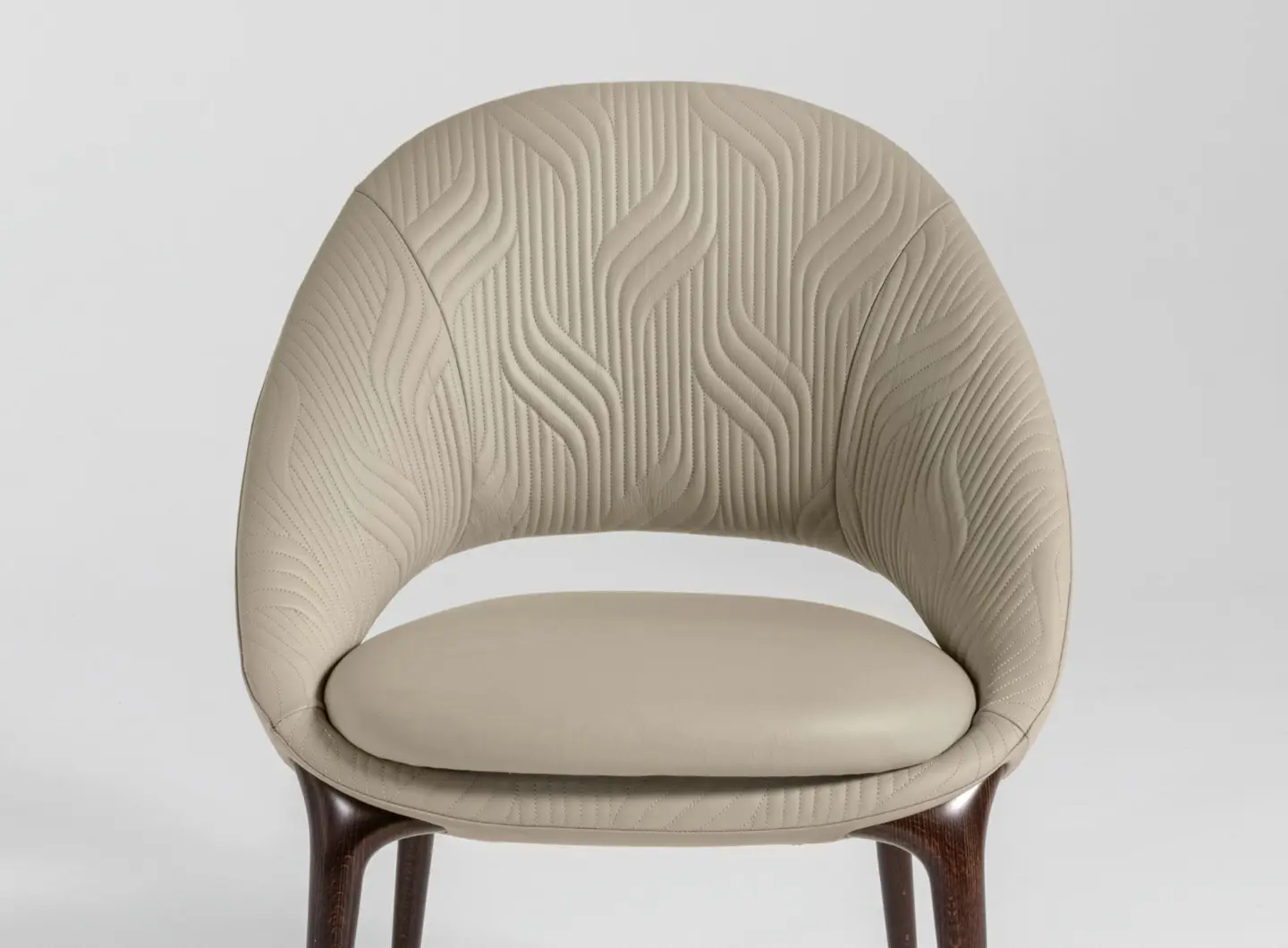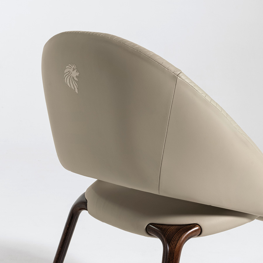 Форма стула отличается обволакивающими очертаниями: плавные изгибы спинки и подлокотников создают ощущение уюта и защищённости. При этом общая линия силуэта остаётся лёгкой и современной — идеально подходящей для dining-интерьеров в стилях contemporary, modern classic или art déco.