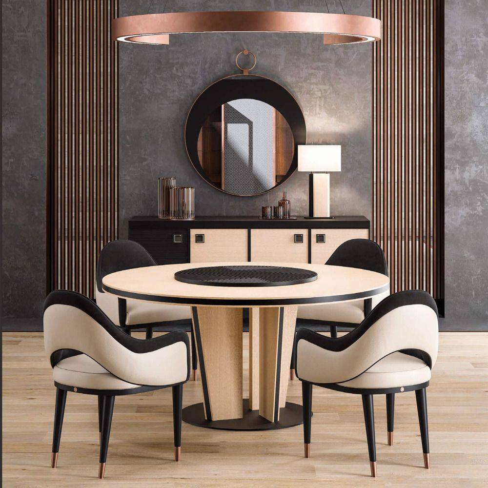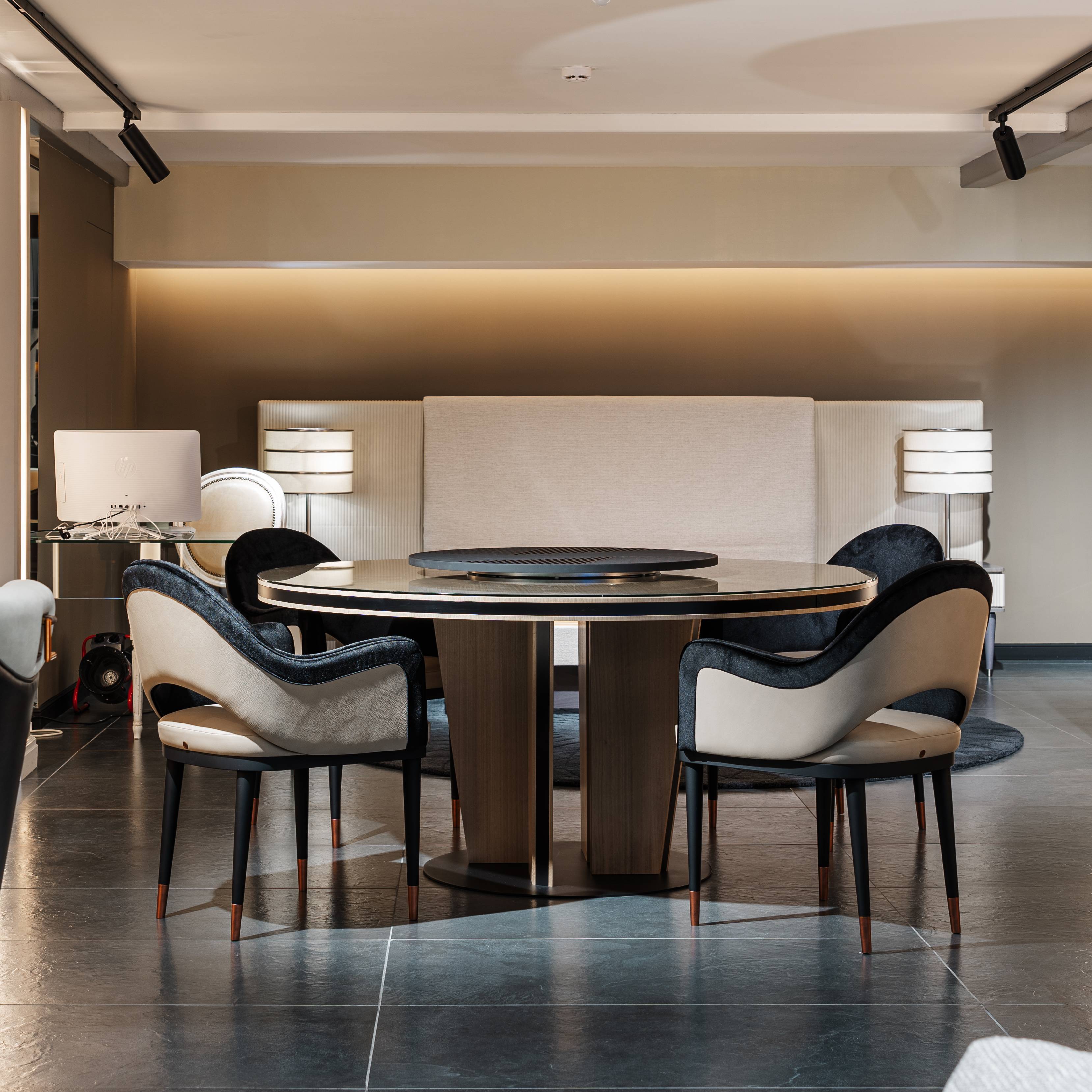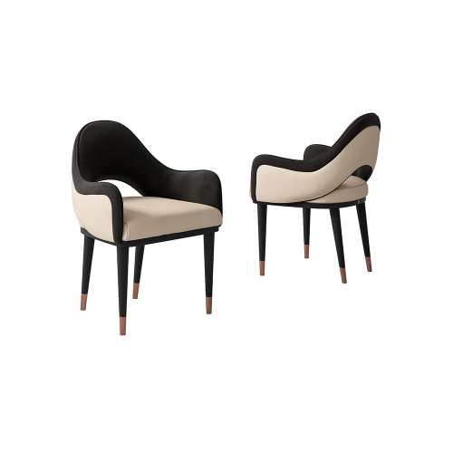 Стул с подлокотниками обит натуральной кожей (рама и сиденье) и тканью (спинка и кант). Ножки в отделке черным лаком с наконечниками из брошированной меди.