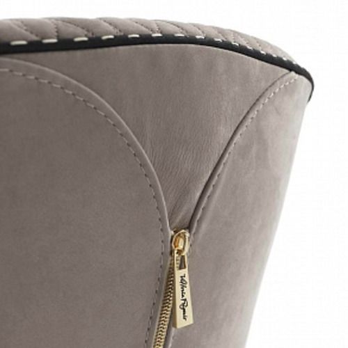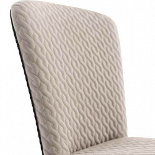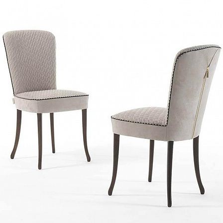 Стул с высокой прямой спинкой. Обивка из кожи или ткани. Чехол несъемный. Декорирован вышивкой в виде косички и контрастными швами. На внешней стороне спинки – молния, выполненная из хромированного золота или, по запросу, с отделкой из черного хрома. Слегка изогнутые книзу ножки из дерева, доступны в отделке Noce Dark, патинированной бронзой или с эффектом глянцевого черного дерева.