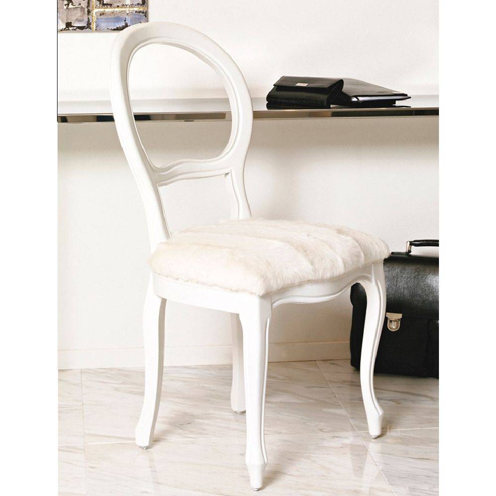 Отделка дерево в белом лаке. Сиденье из меха, цвет серо-бежевый.