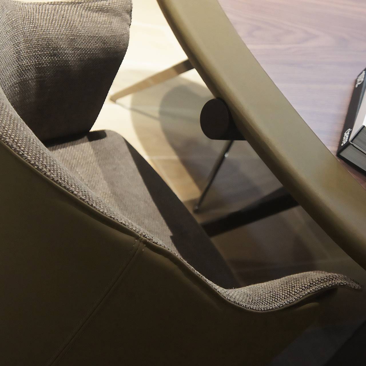 Стул с подлокотниками Boheme Cierre. В наличии в тканевой обивке серого цвета с отделкой спинки из тёмно-зелёной кожи.