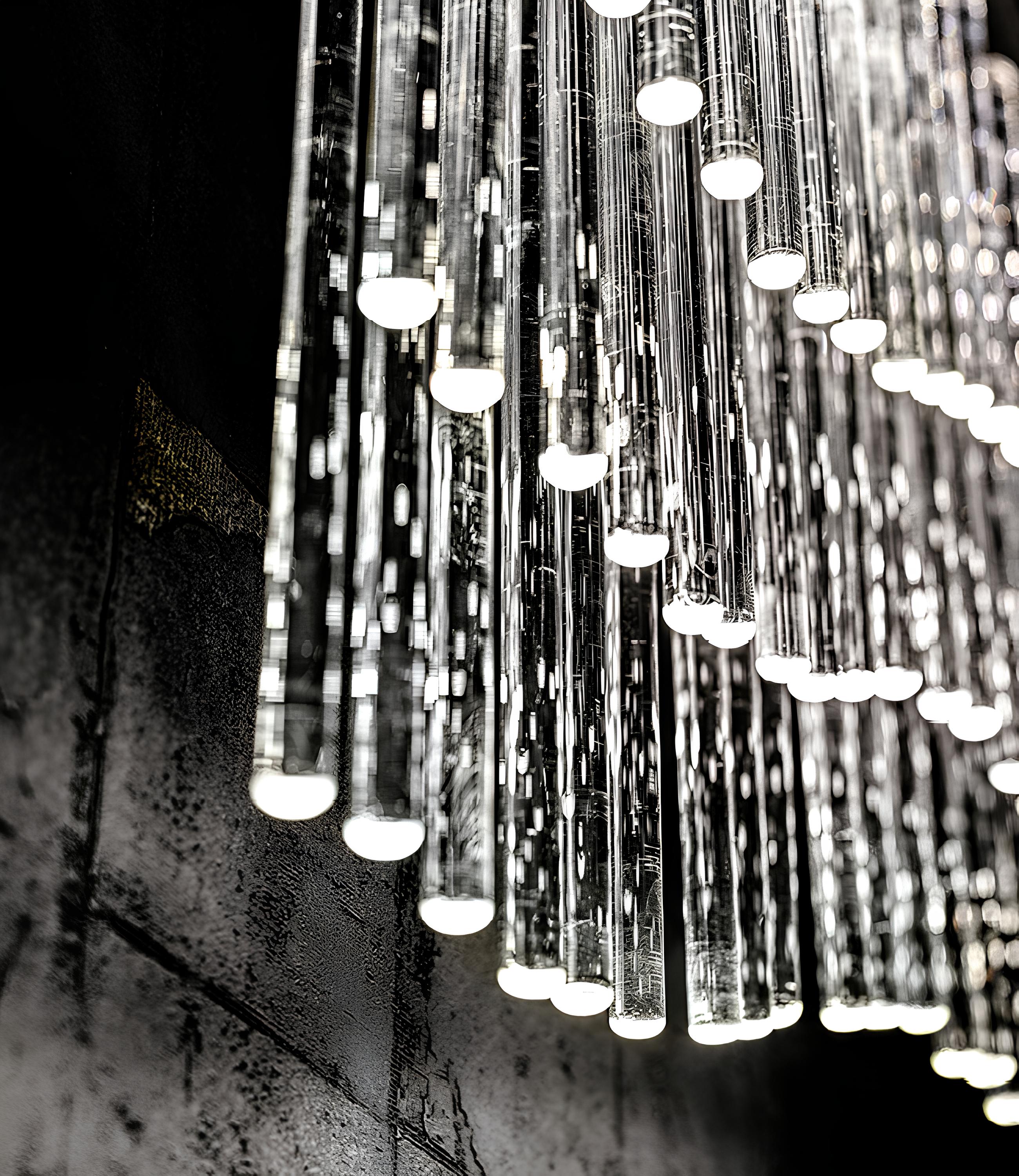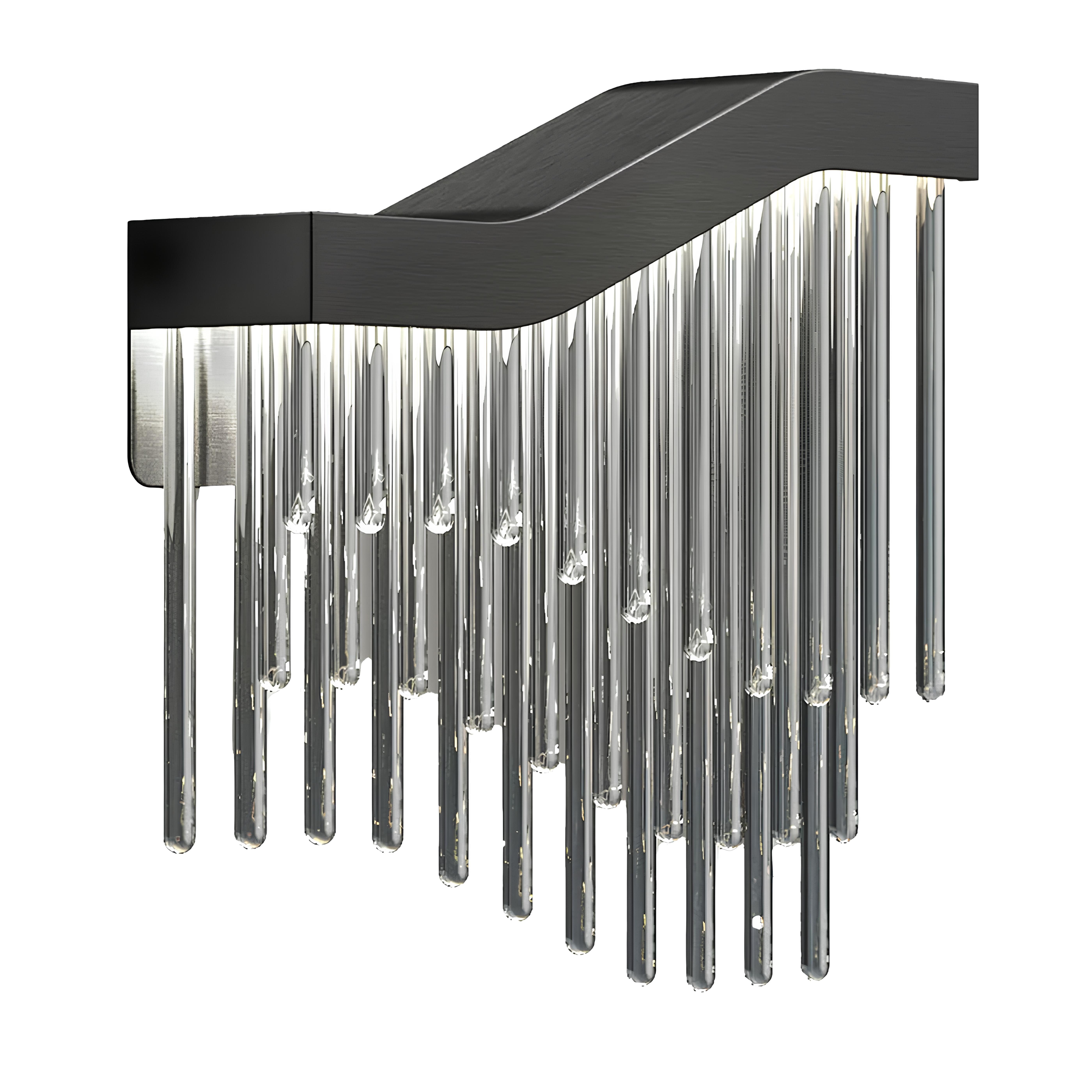 В основе конструкции — нержавеющая сталь с гальваническим сатинированным покрытием Black Satin Nickel. Матовый чёрный никель с едва уловимым металлическим блеском придаёт светильнику современное звучание, подчёркивая графичную изогнутую форму и создавая изысканный визуальный контраст с прозрачными стеклянными элементами.