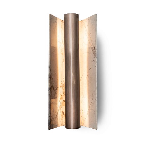 Настенный светильник из цельного мрамора призматической формы с основанием в виде буквы "V". Ножка-рассеиватель из нержавеющей стали с рассеяным светодиодным источником света мощностью 10 Вт и двумя точечными светильниками GU10 max 5OW. Несущая конструкция из металлического профиля круглого сечения с низковольтной проводкой и источником питания, размещенным в кронштейне для настенного монтажа. Цельный мрамор доступен в цветах Invisible grey, Elegant Dune и Emperador Light. Вес 18 кг.