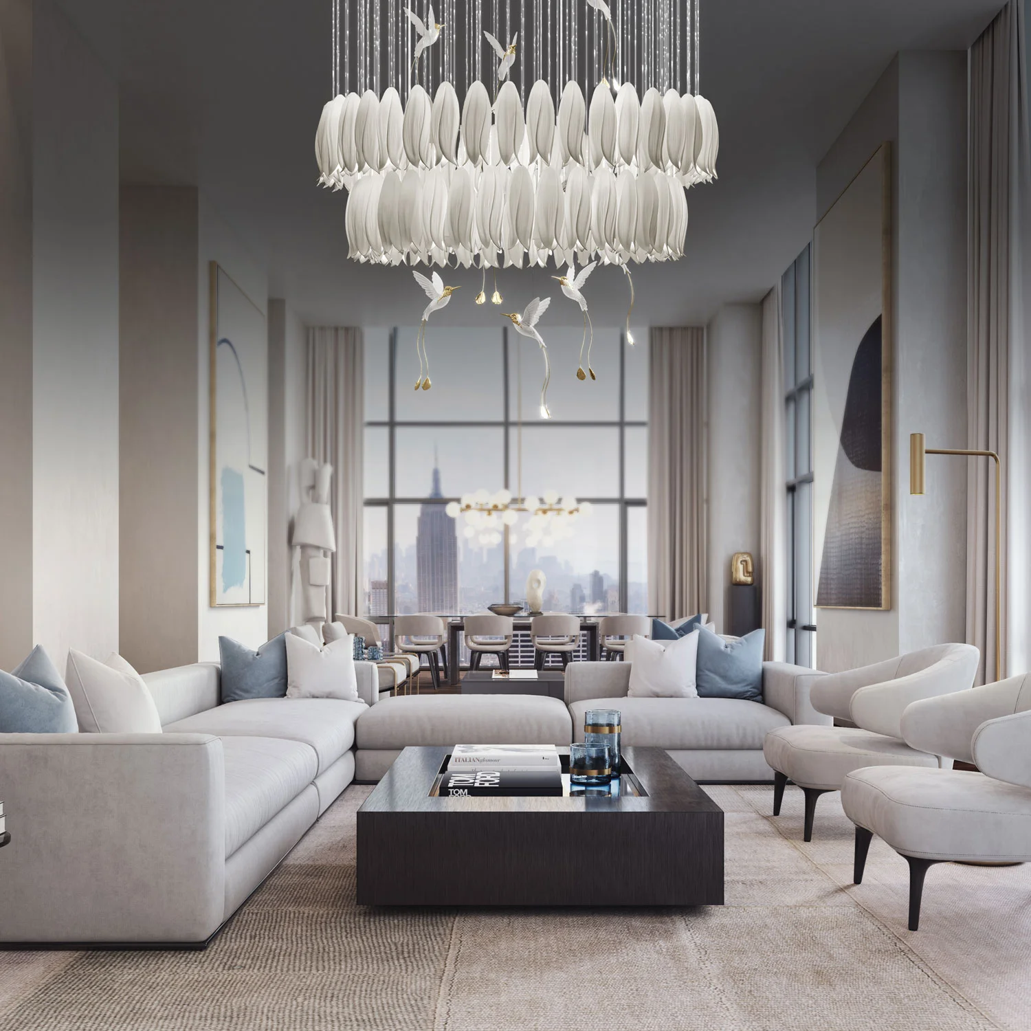 В коллекции Alba фарфоровые подвесы выполнены в виде цветов, расположенных на светящихся «стеблях» из оптоволоконных нитей. Внутри кольца из цветов кружит стайка фарфоровых колибри.