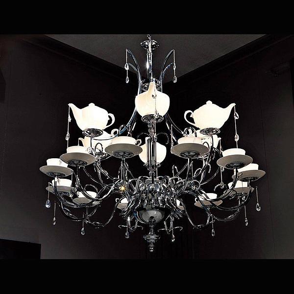 Структура из хромированной латуни, украшенная подвесками из хрусталя Schöler. «Чашки с тарелками» и «чайники» выполнено из тонкого фарфора. 18 ламп G9, макс. 25 Вт каждая. Хромированная цепь длиной 150 см и потолочная чашка.