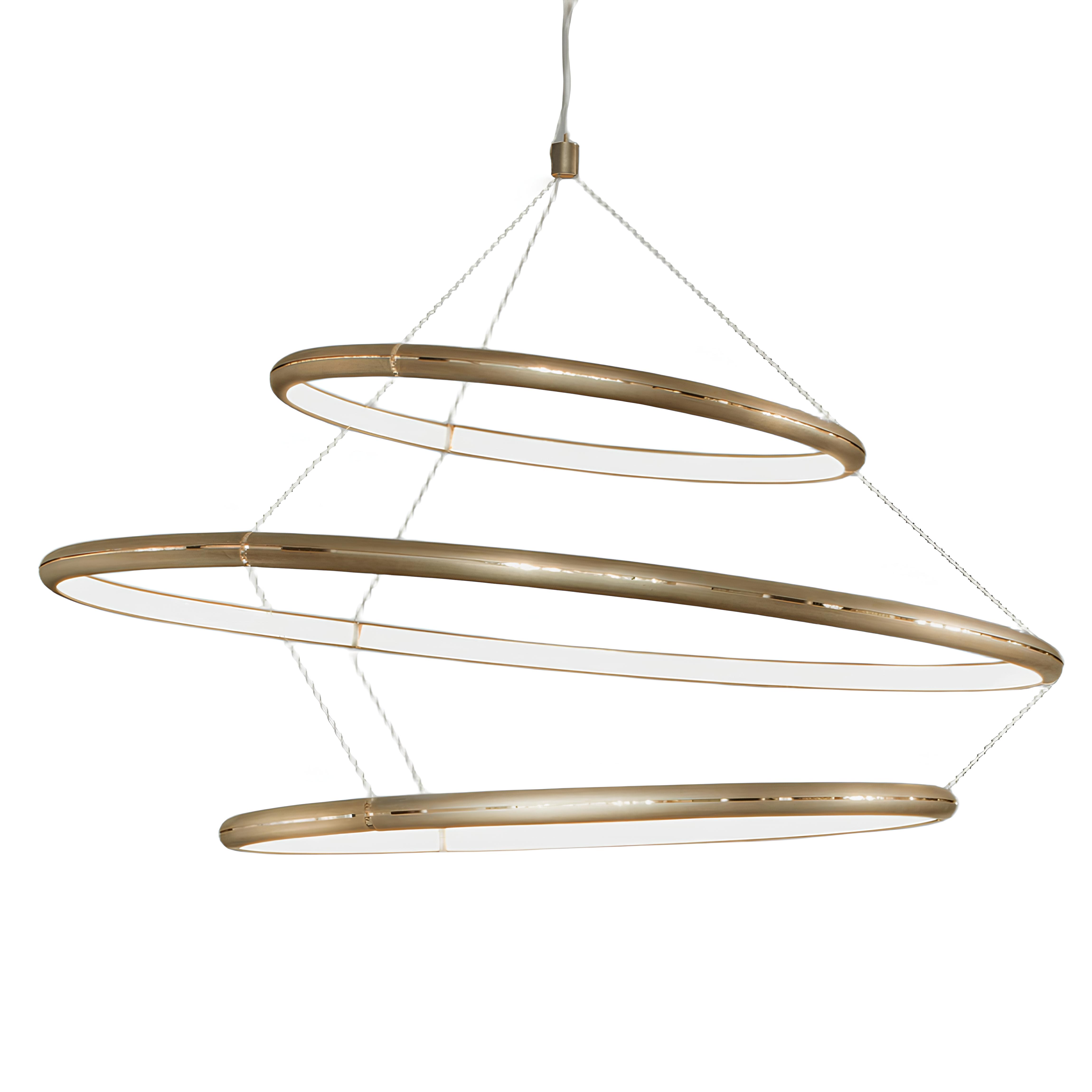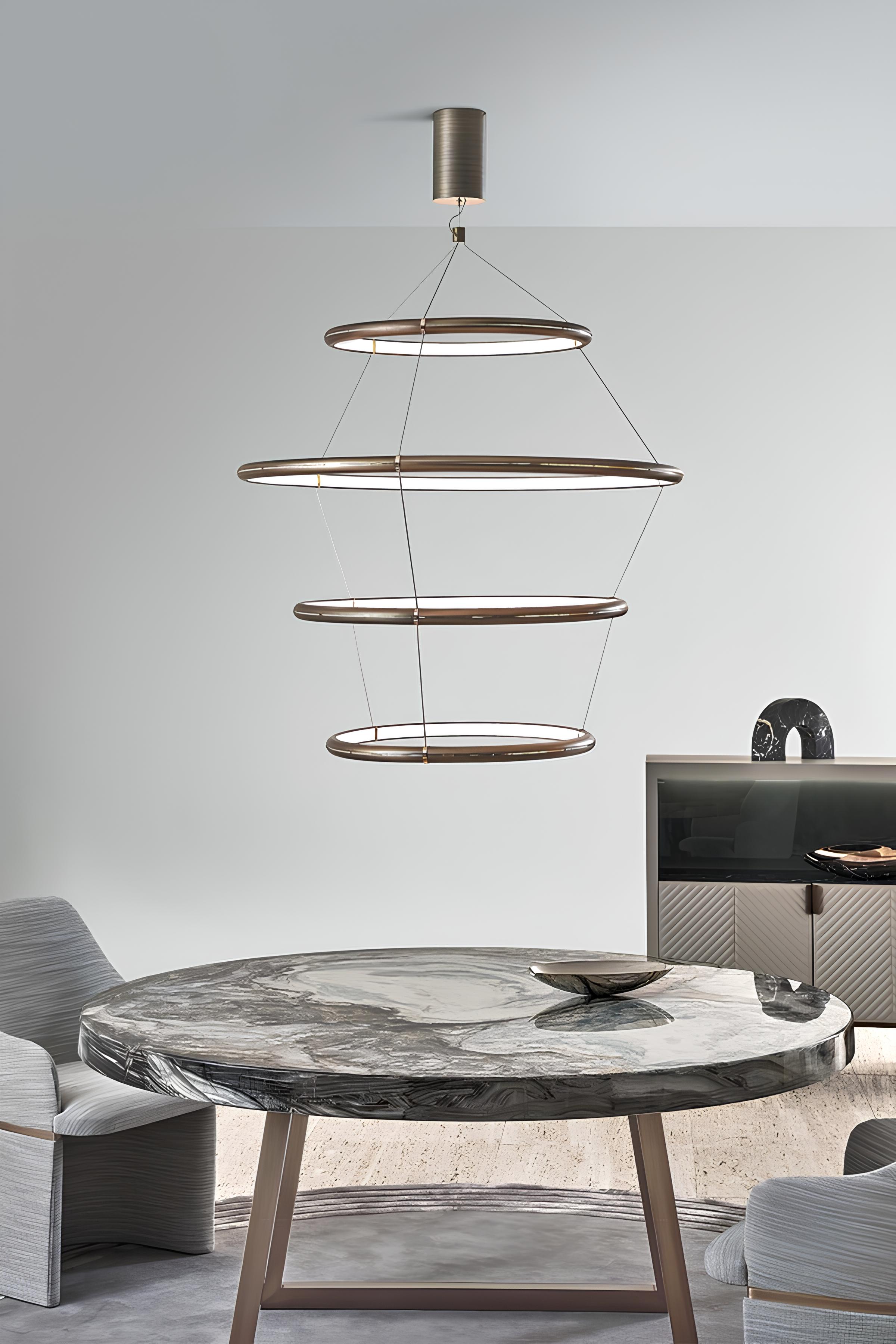 Halo органично вписывается в современные интерьеры — от строгого минимализма до ар-деко и эклектики. Простая форма кольца придаёт пространству графичность и лёгкость, а сочетание бронзы и золота вносит ощущение теплоты и благородства.