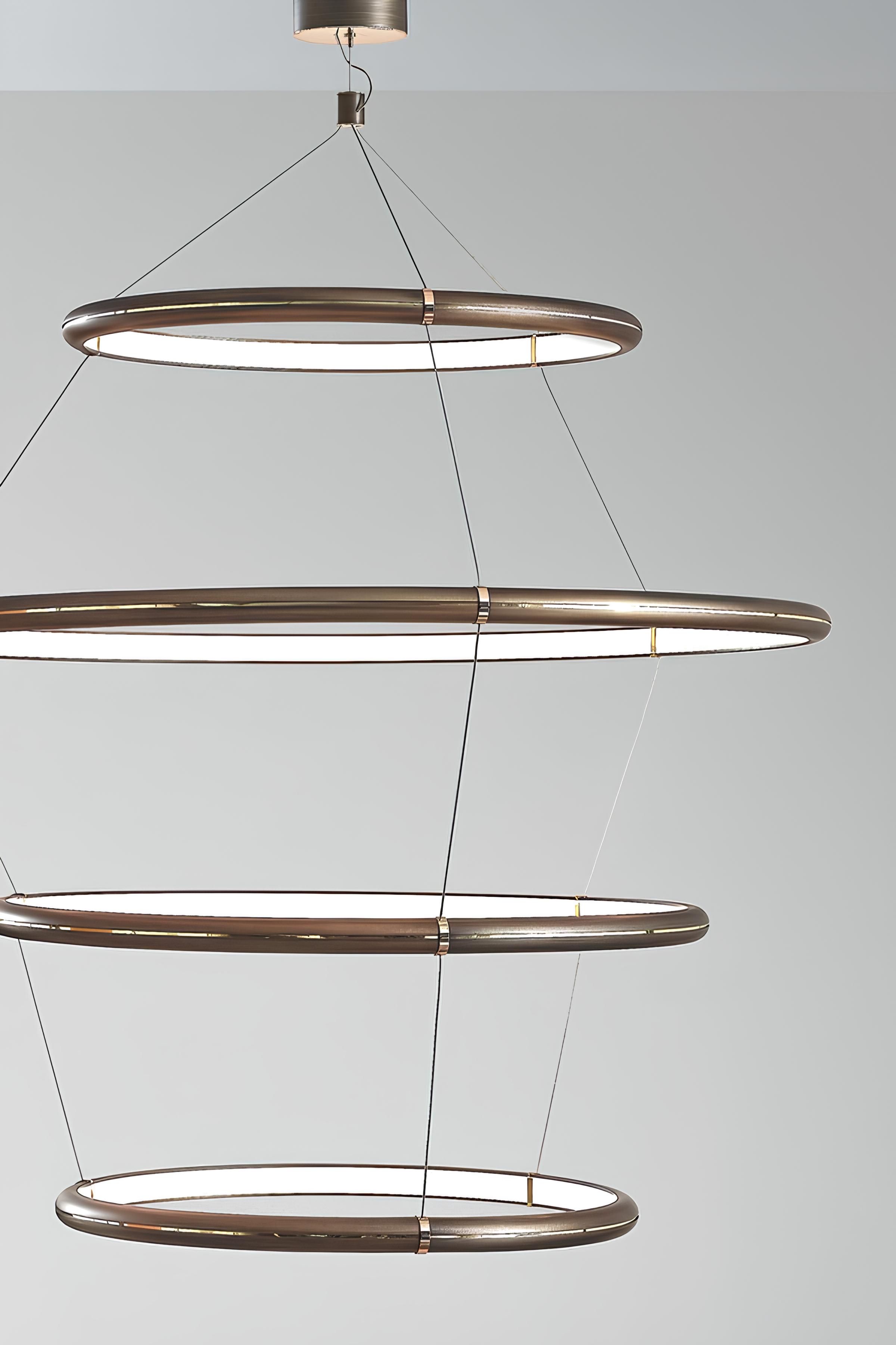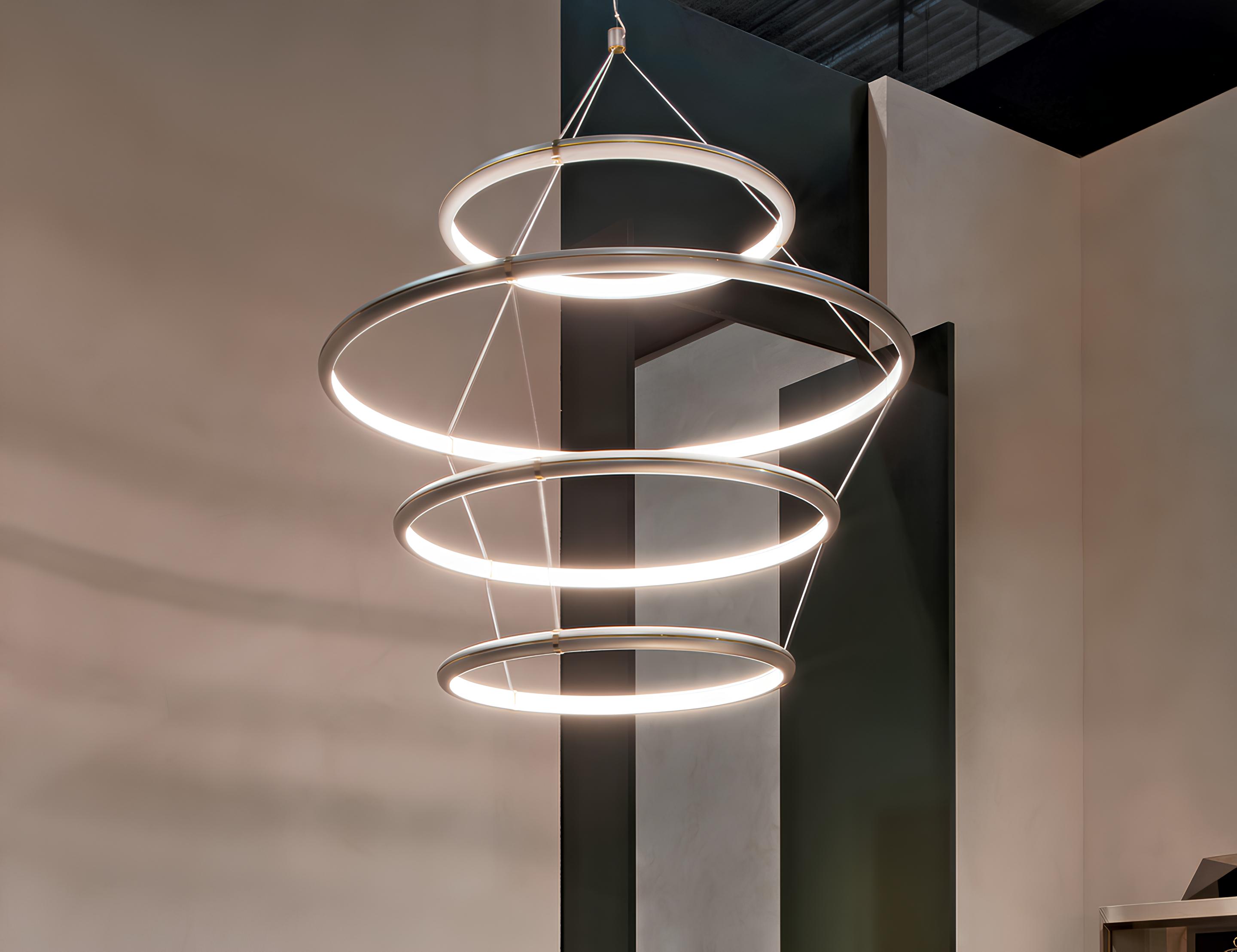 Главная особенность Halo заключается в возможности вариативного использования колец: как самостоятельных элементов для минималистичных интерьеров, или в виде гармоничных многослойных композиций, которые напоминают световую инсталляцию и становятся настоящим арт-объектом.