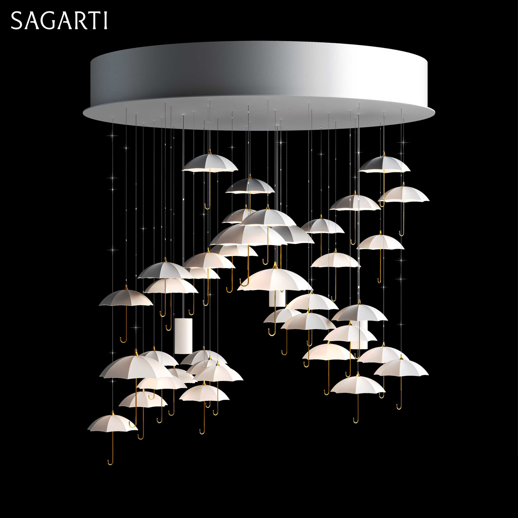 Материал подвесных зонтов: бисквитный костяной фарфор, жидкое золото, кристаллы Swarovski.
