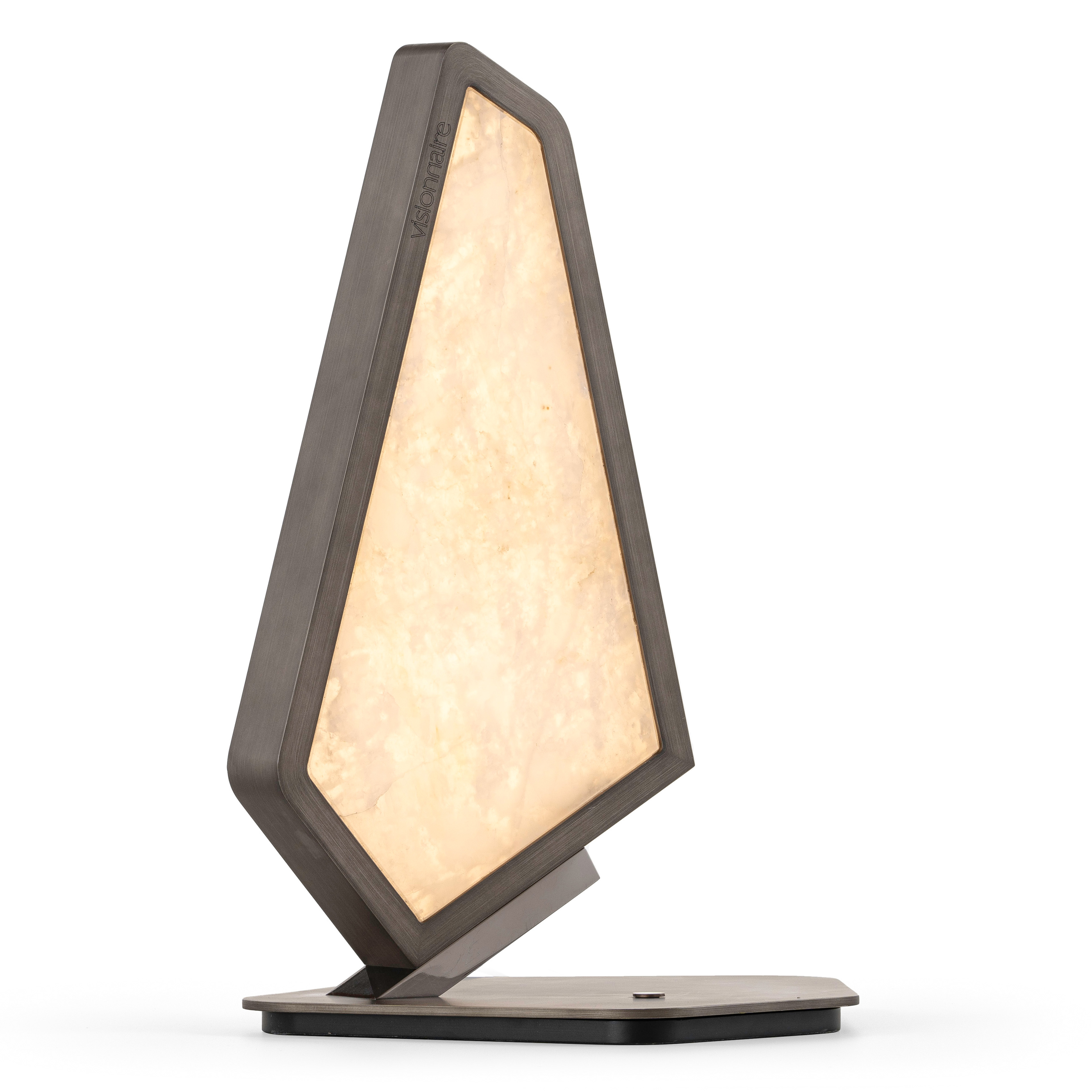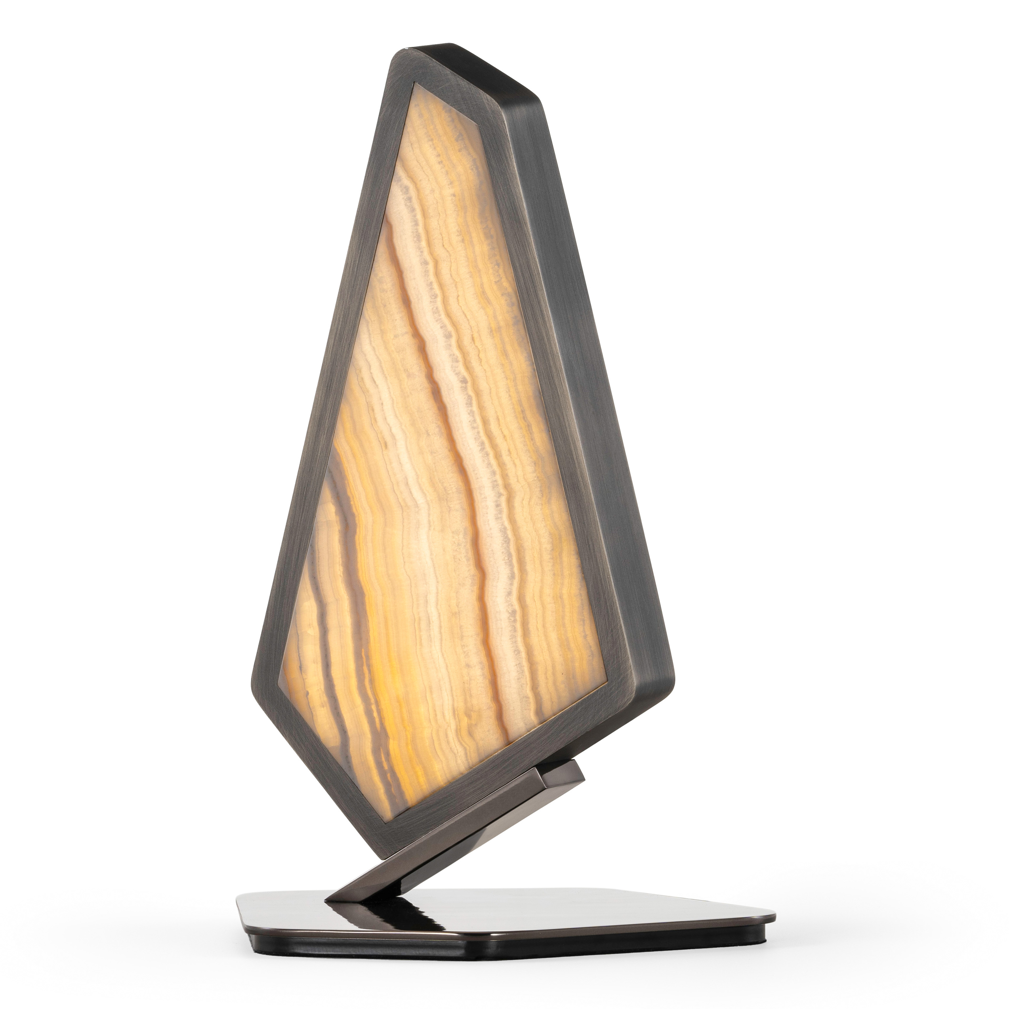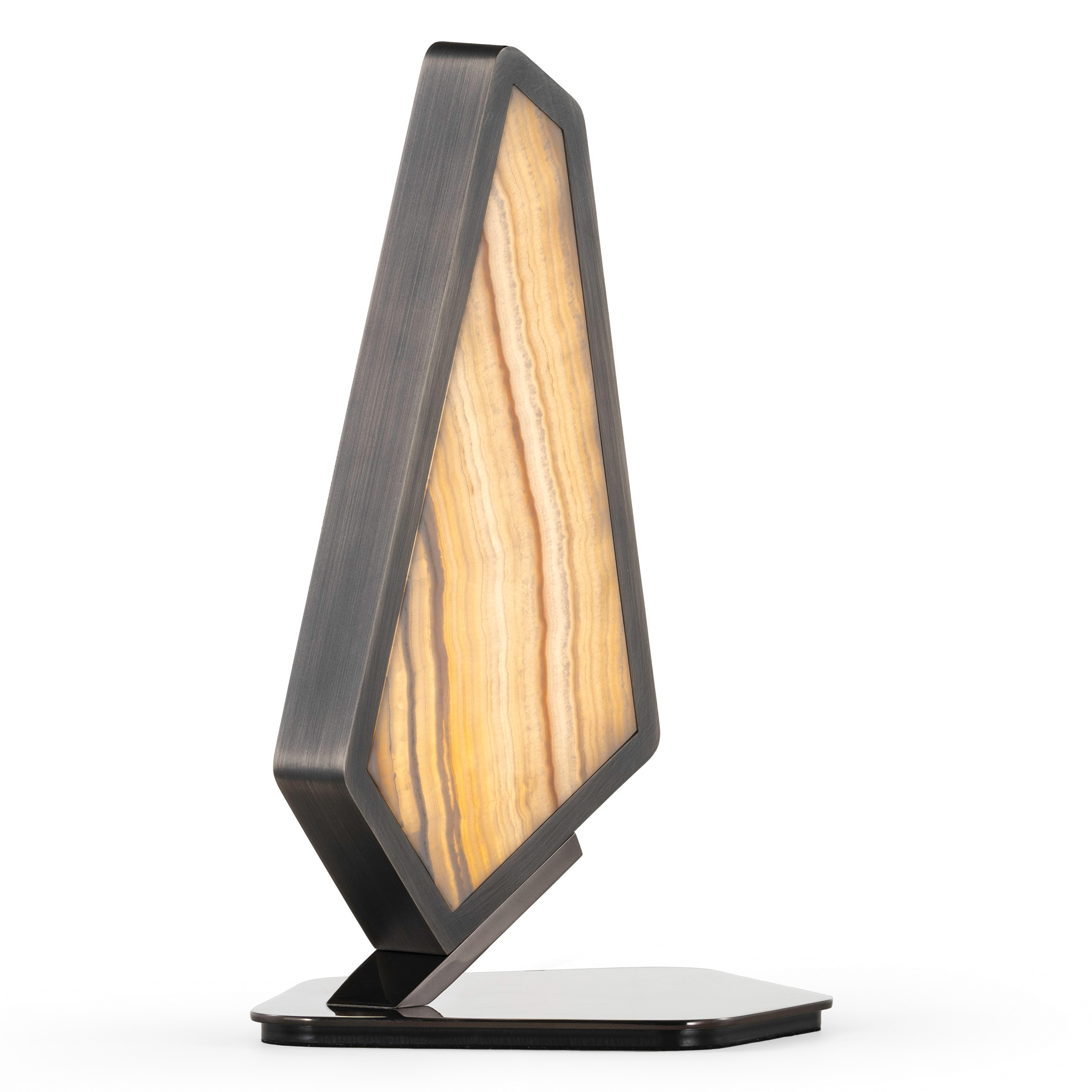Верхняя часть оснащена двойным рассеивателем, выполненным из оникса или тонкого сатинированного кварца: оба материала деликатно фильтруют свет, создавая тёплое, рассеянное свечение и акцентируя глубину и рисунок камня.