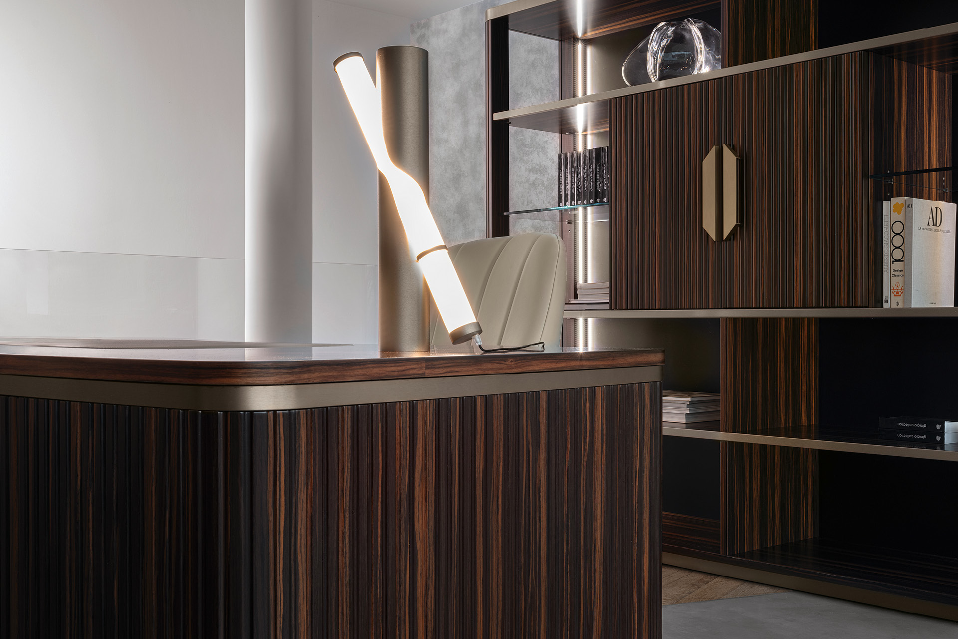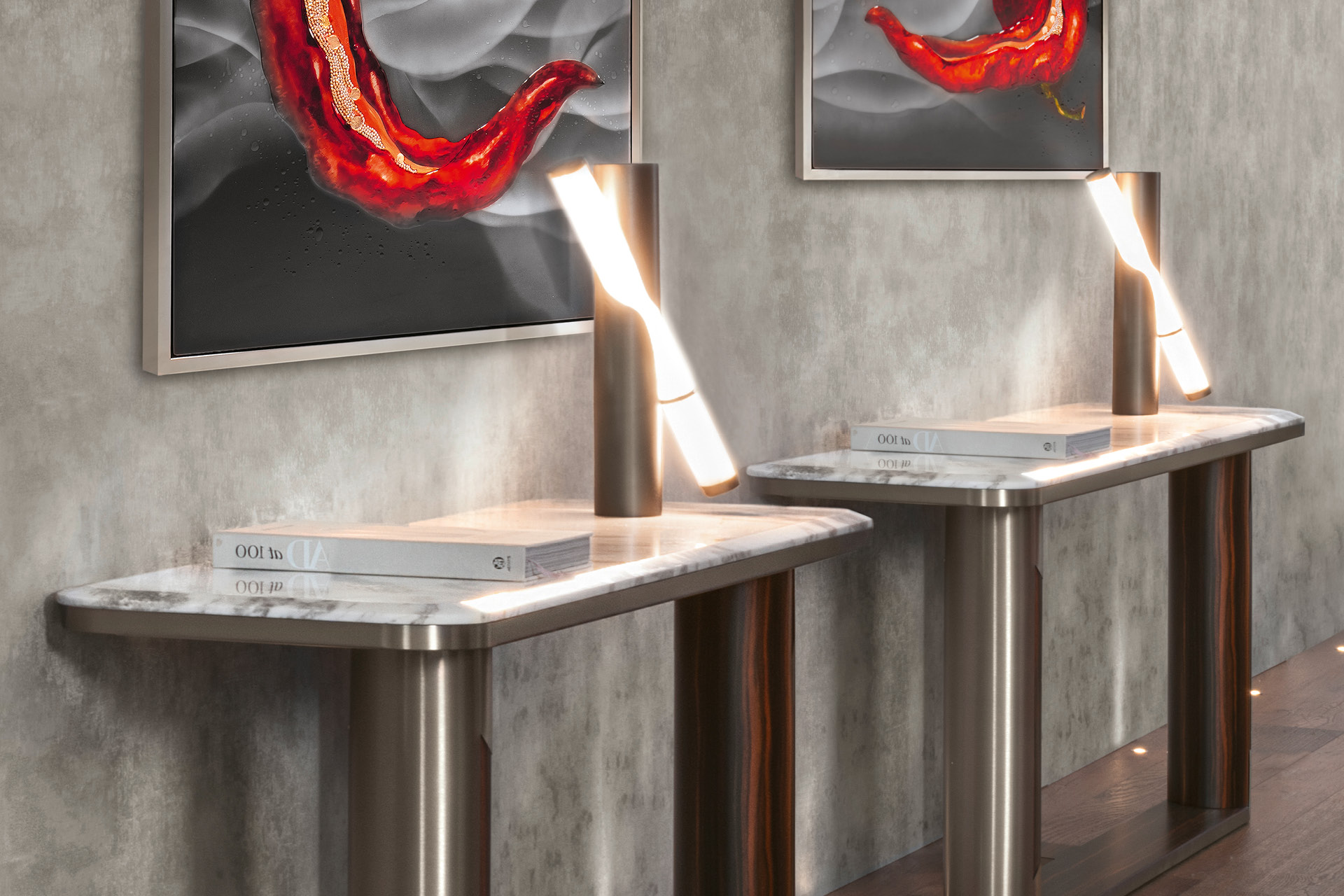 Основание лампы выполнено из сатинированной нержавеющей стали с гальванической титановой отделкой. Лёгкий металлический блеск и характерная матовая текстура придают изделию современный, почти архитектурный облик, в котором читается ДНК Giorgio Collection — сдержанная роскошь в каждой детали.