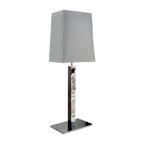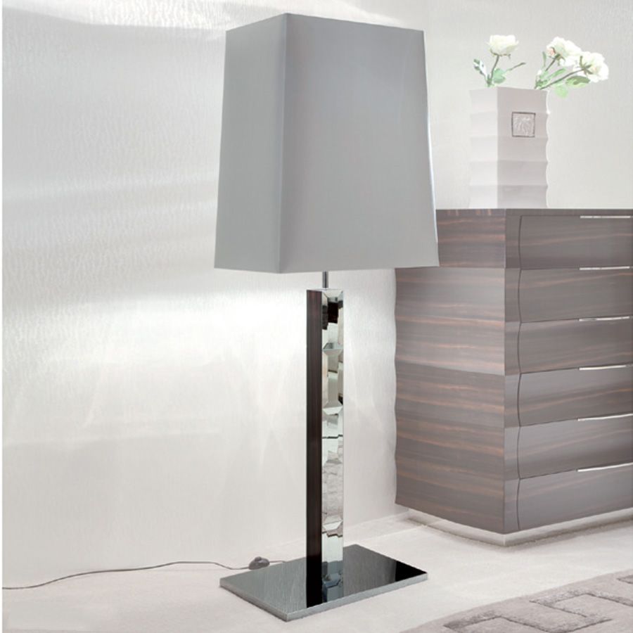 Напольная лампа на основании из хромированной нержавеющей стали, облицованном шпоном из макасарского эбена с матовым полиэфирным покрытием и зеркалами с фацетом. Абажур из атласного шёлка белого цвета.