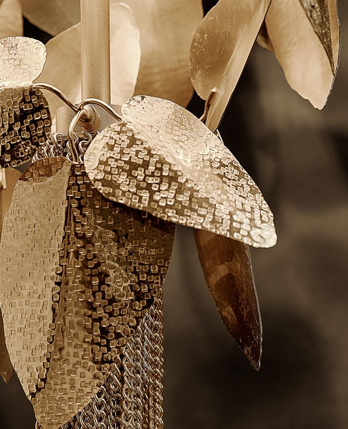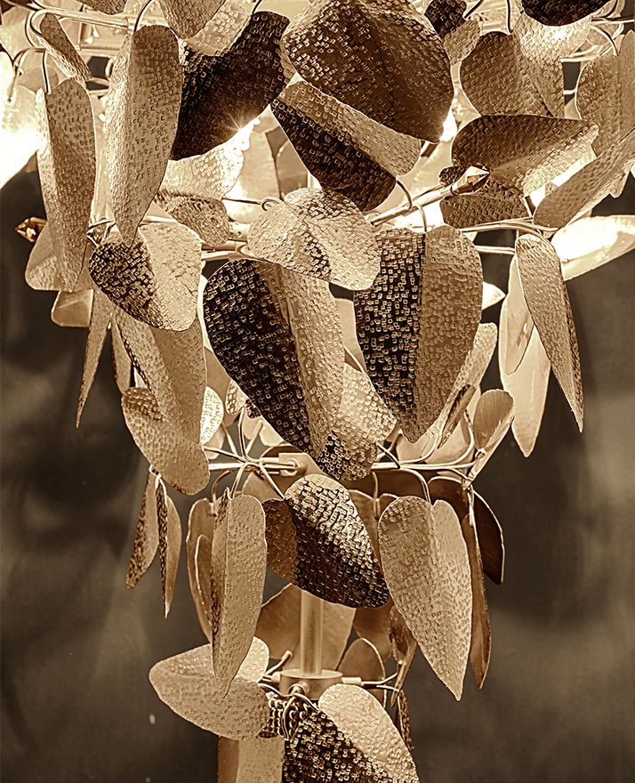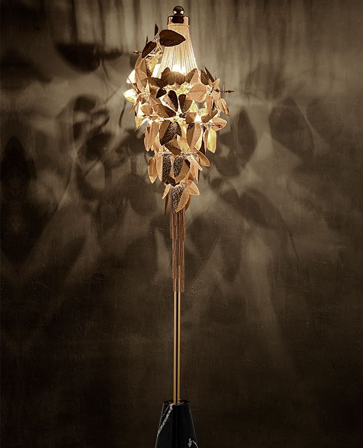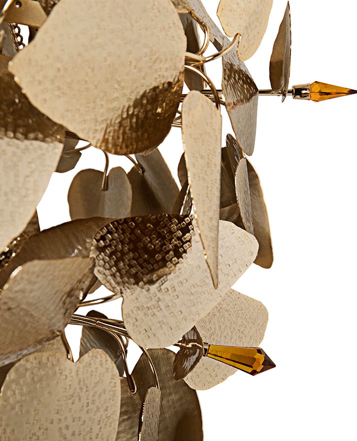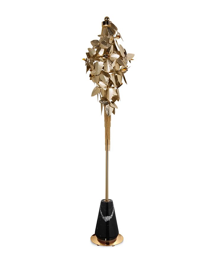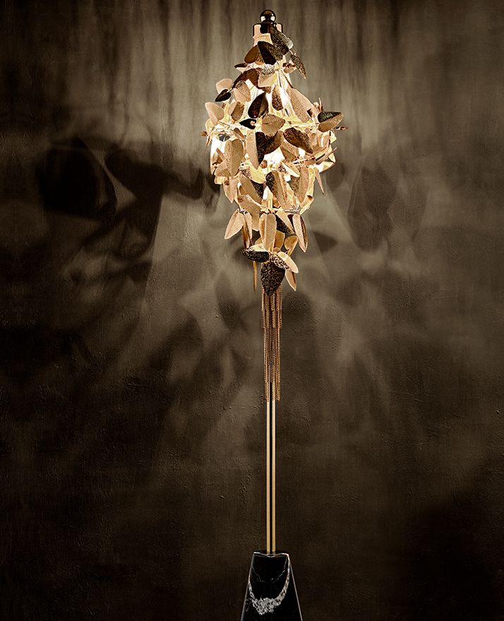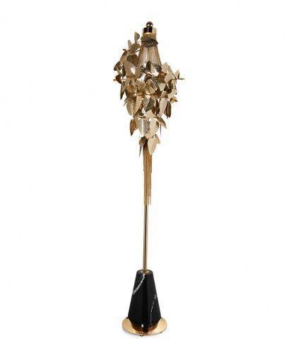 Основание из мрамора, структура из латуни. Торшер представлен сложной комбинацией позолоченных кованых листьев из латуни и кристаллов Swarovski янтарного цвета.