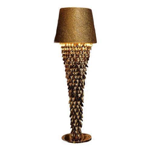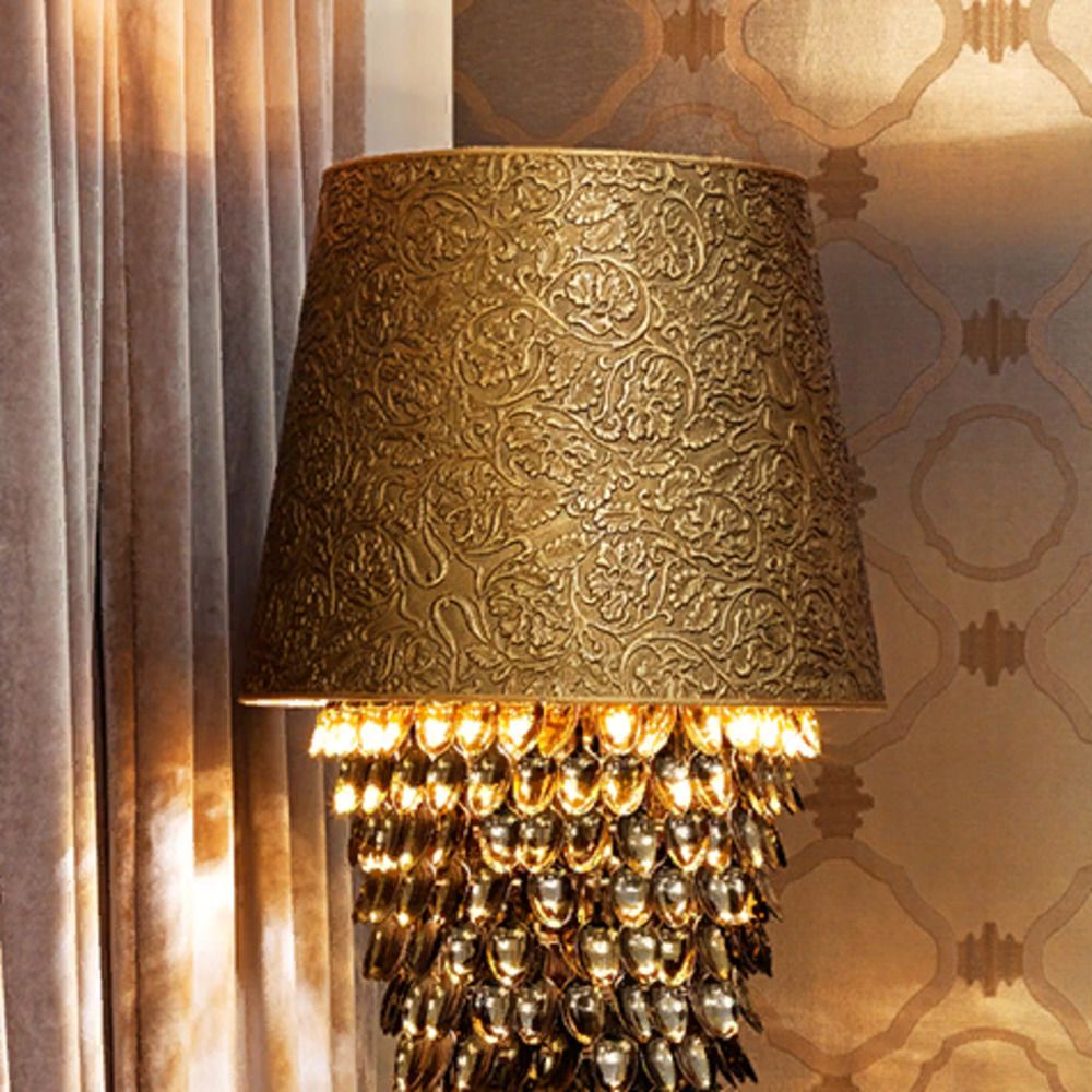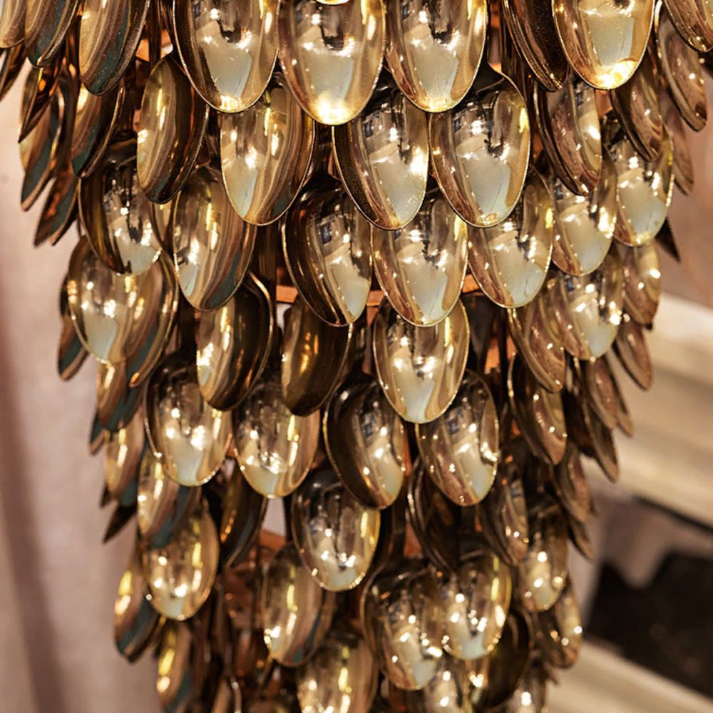 Основание из латуни, украшенное множеством декоративных ложек. Абажур из кожи с тиснением. Цвет золотой.