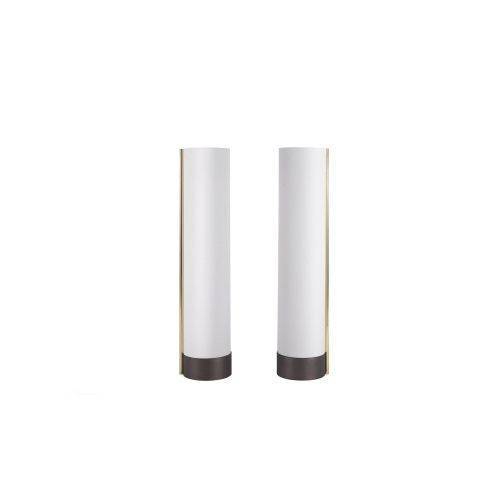 Торшер на металлической основе с темной бронзовой отделкой. Абажур из белой ткани с профилем из глянцевой латуни.