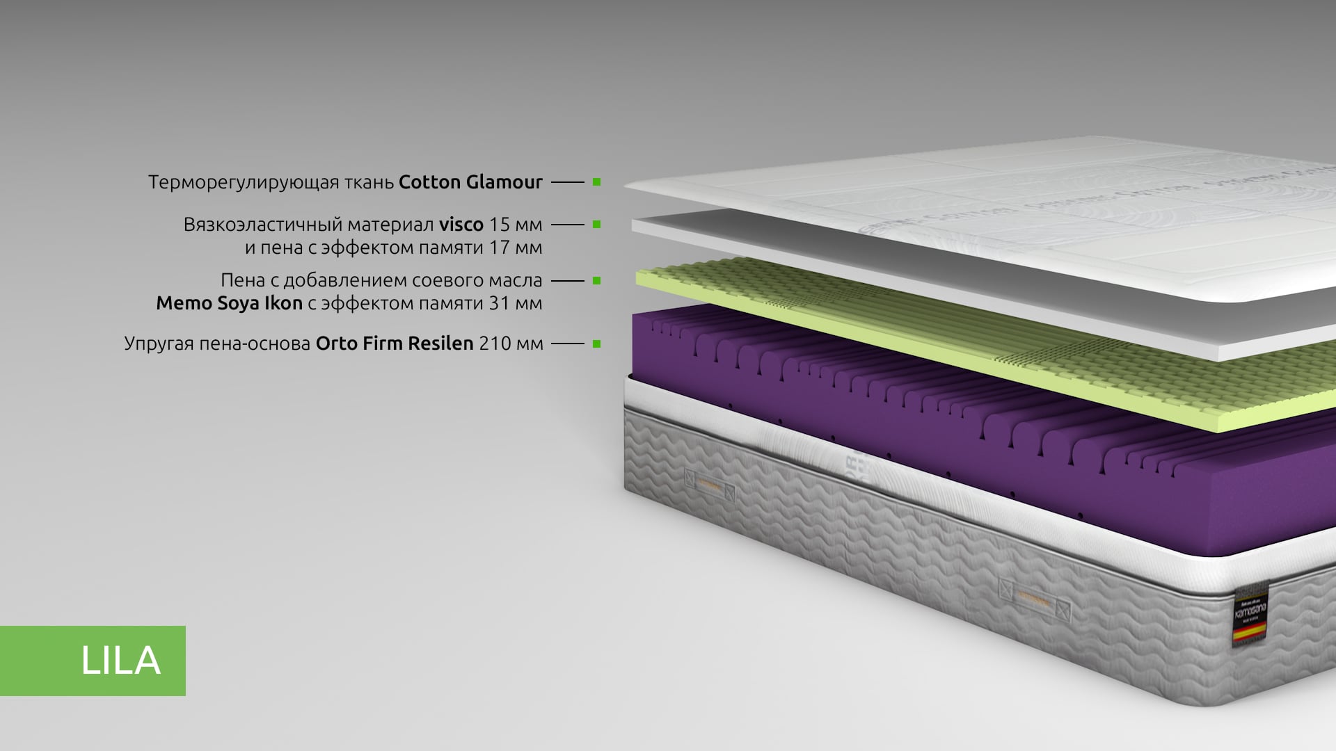 ЧЕХОЛ БЛОКА: Терморегулирующая ткань Cotton Glamour В чехол вшит вязкоэластичный материал с эффектом памяти Memo Body Ikon® h = 20 мм СОСТАВ ОСНОВНОГО БЛОКА: - Пена с добавлением соевого масла Memo Soya Ikon® с эффектом памяти (плотность 50 кг/м3, компрессия 1,60 кПа) h= 31 мм - Комфортно-жёсткая пена-основа Orto Firm Resilen® (плотность 50 кг/м3, компрессия 4,00 кПа) h= 210 мм В этом матрасе мы постарались совместить две характеристики: комфортную мягкость верхнего слоя и уверенную поддержку нижнего. Верхний слой матрасного блока Memo Soya Ikon® с добавлением соевого масла обладает эффектом памяти, отлично дышит и самое главное — обеспечивает высокий анатомический эффект, практически снимая обратное давление на тело человека со стороны матраса. Дополнительно он профилирован, за счёт чего создаётся лёгкий массажный эффект и улучшается воздухообмен. Несущий нижний слой материала основы с высокой компрессионной устойчивостью, в сочетании с верхним мягким анатомическим слоем, создаёт идеальную поддержку спины с умеренным уровнем комфорта. Деление нижнего блока на анатомические придаёт матрасу оптимальную эргономику и адаптацию матраса в местах значительных весовых нагрузок. Посмотреть краткий обзор матраса.
