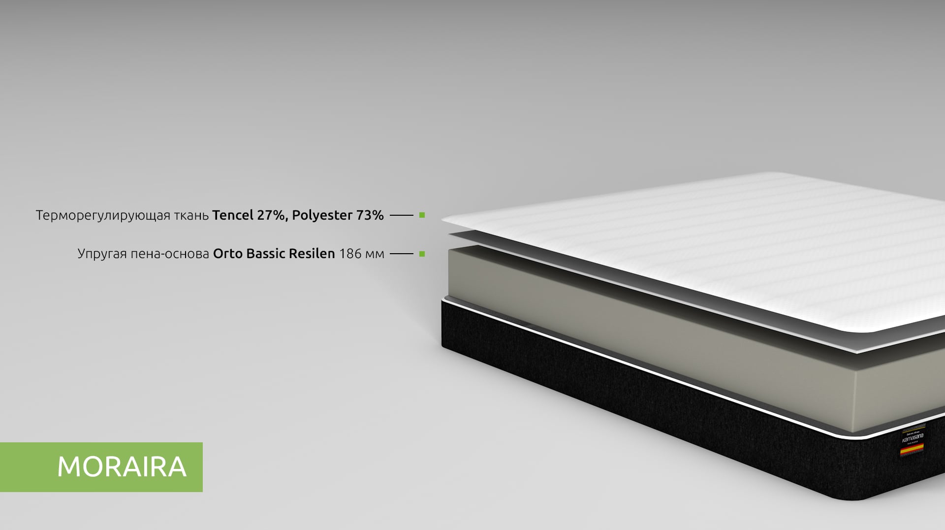 ЧЕХОЛ БЛОКА: Терморегулирующая ткань Tencel® СОСТАВ ОСНОВНОГО БЛОКА: Пена Orto Bassic Resilen® (плотность- 30кг/м³, компрессия 3,70 KПa ) - 18,6 см Плотный беспружинный матрас для любителей умеренного комфорта. Однослойный внутренний блок изготовлен из материала-основы Orto Bassic®, обладающего высокой упругостью. Высокая стойкость к продавливанию и деформации позволяют матрасу выдерживать высокие весовые нагрузки (до 160 кг на спальное место) без изменений и повреждений структуры материала. Матрас односторонний, подойдет пользователям, которые любят комфортную ортопедическую поддержку без лишней мягкости, в том числе детям и подросткам Съемный чехол из терморегулирующей ткани Tencel® из древесины австралийского эвкалипта, с вшитым слоем материала с эффектом памяти Memo Body Ikon® мгновенно подстраивается под особенности Вашего тела и обеспечивает комфортный микроклимат в зоне сна. Посмотреть краткий обзор матраса.