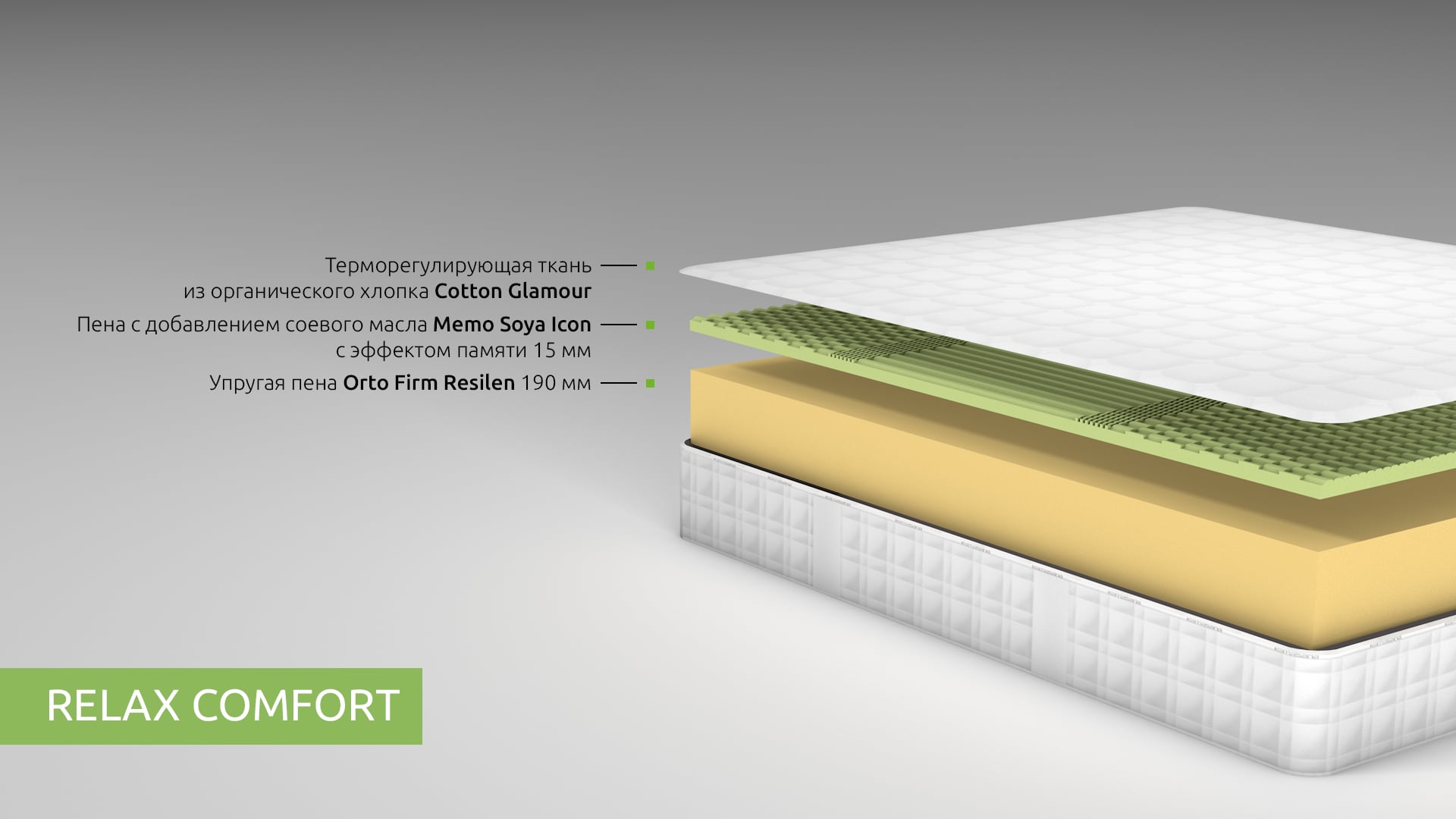 ЧЕХОЛ БЛОКА: Терморегулирующая ткань Tencel® В чехол вшит материал с эффектом памяти Memo Body Ikon® 15 мм СОСТАВ ОСНОВНОГО БЛОКА: Пена Orto Medium Resilén® (плотность 50 кг/м³, компрессия 2,70 Kpa). Матрас RELAX COMFORT обеспечивает правильный и комфортный сон, равномерно распределяя вес тела на поверхности матраса, благодаря хорошему ортопедическому и анатомическому эффектам. Несущий нижний слой материала основы с высокой компрессионной устойчивостью создаёт идеальную поддержку спины. Посмотреть краткий обзор матраса.