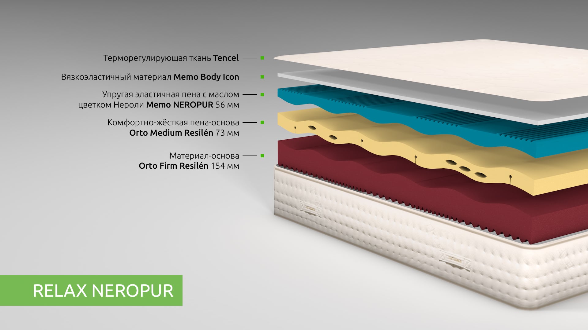 ЧЕХОЛ БЛОКА: Терморегулирующая ткань Tencel® 100% В чехол вшит вязкоэластичный материал Memo Soya Icon® h= 20 мм СОСТАВ ОСНОВНОГО БЛОКА: - Пена Memo Neropur® упругий вязкоэластичный материал с маслом цветков Нероли и эффектом памяти (плотность 50 кг/м³, компрессия 2,70 Кпа). h = 56 мм. - Упругая пена-основа Orto Medium Resilén® (плотность 50 кг/м³, компрессия 2,70 Kпа). h = 73 мм. - Комфортно-жёсткая пена-основа Orto Medium Resilén® (плотность 50 кг/м³, компрессия 3,40 Kпа). h = 154 мм Матрас Relax Neropur – относится к серии «Премиум» матрасов компании KAMASANA. Верхний слой блока изготовлен из уникального инновационного материала NEROPUR® с добавлением масла цветков апельсинового дерева (нероли) обладающим повышенной эластичностью. Свежий апельсиново-медовый аромат Neropur действует как антидепрессант, снимает напряжение и помогает бороться с бессонницей. Дополнительно он, за счёт чего создаётся лёгкий массажный эффект и улучшается воздухообмен. Внутренний блок матраса изготовлен с использованием технологии Ocean Wave, что позволяет максимально адаптироваться пене под физиологические изгибы тела человека, придать правильное положение позвоночнику и расслабить мышечный каркас. Несущие нижние слои блока с высокой компрессионной устойчивостью в сочетании с верхним мягким анато­мическим слоем создают идеальную поддержку спины с высоким уровнем комфорта. Посмотреть краткий обзор матраса.