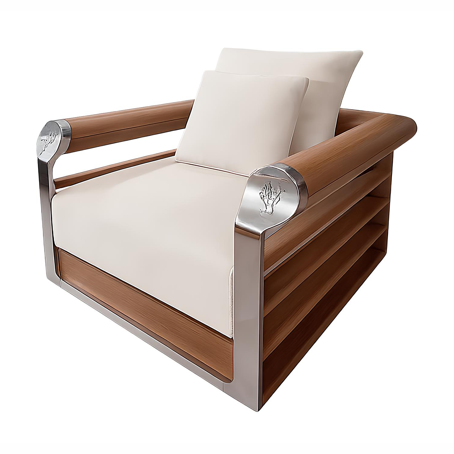 Особое внимание заслуживают декоративные накладки на подлокотниках: выполненные из литого алюминия с зеркальной полировкой и покрытые двойным защитным лаком, они подчеркивают премиальный характер изделия.