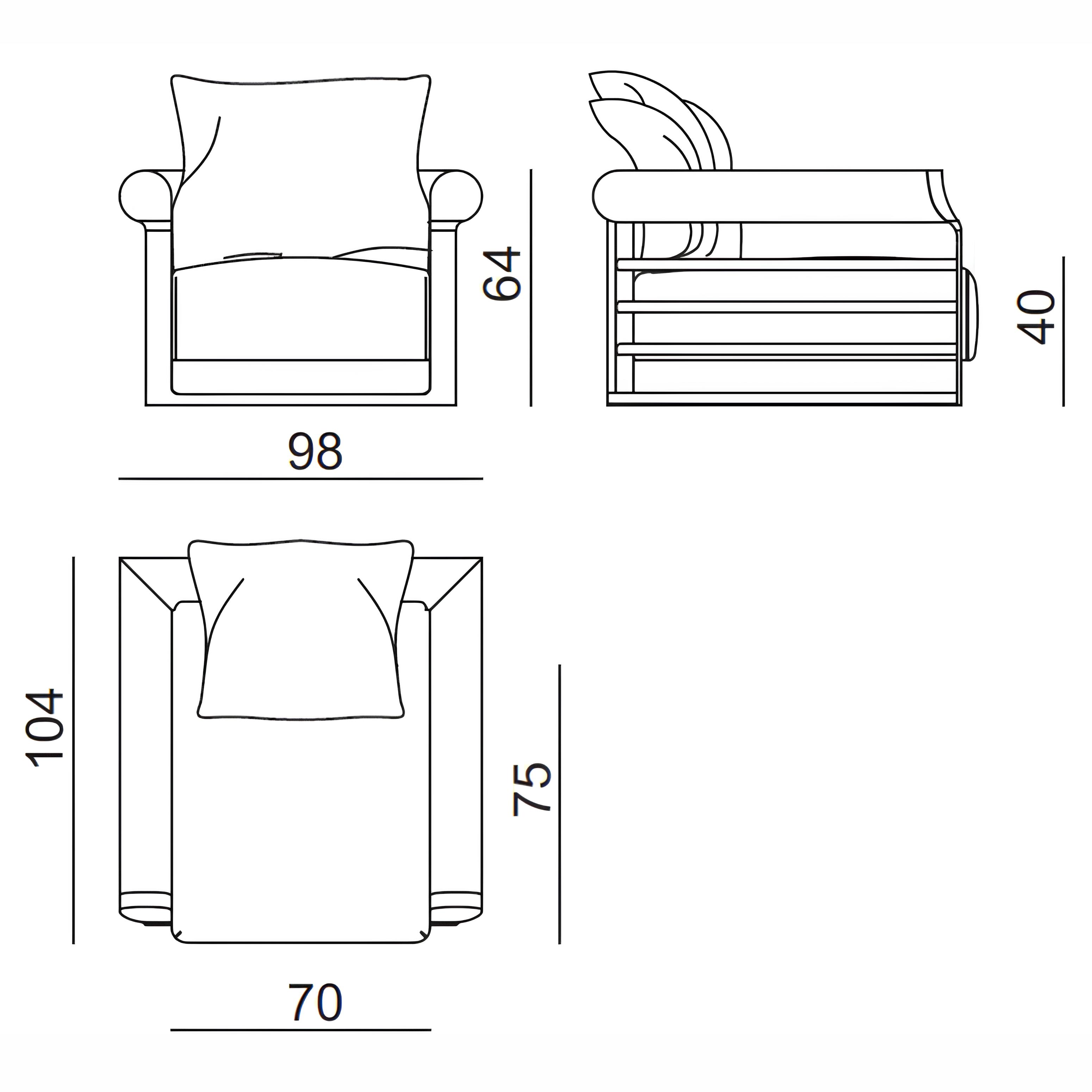 Cпинка с фиксированной подушкой, создающей монолитный, графичный облик. Возможна частичная отделка подлокотников и спинки кожей из коллекции Dehors — для дополнительного акцента и тактильного разнообразия.