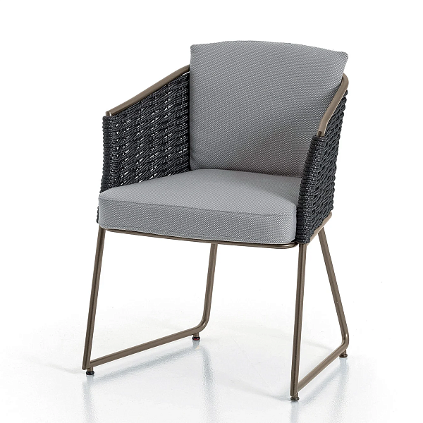 Элегантная вставка из декоративной синтетической верёвки, вручную оплетающая конструкцию, делает стул живым элементом декора: выбор между серой или зелёной верёвкой позволяет адаптировать модель под природный или урбанистический контекст.
