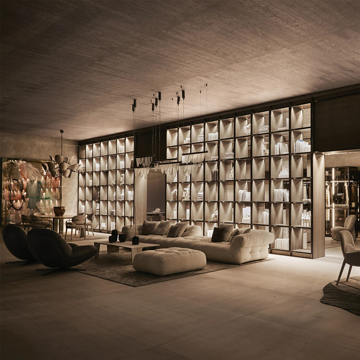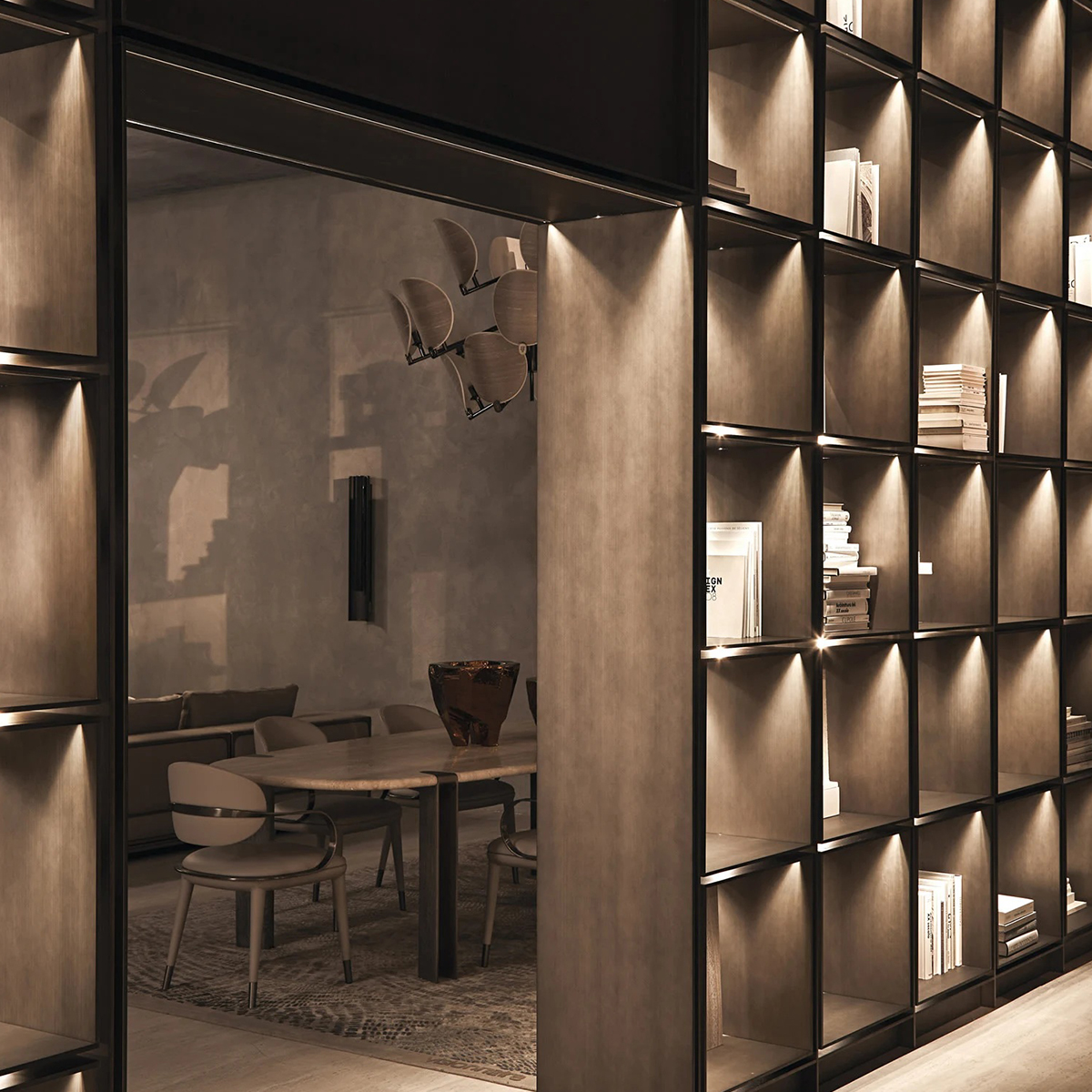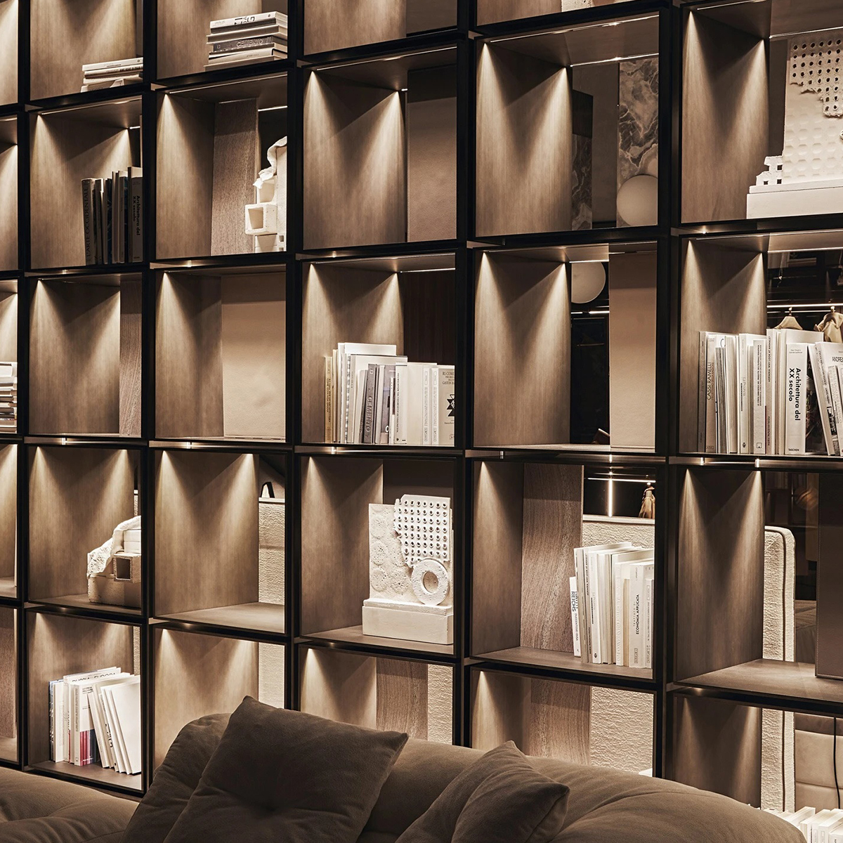 C-Square по проекту Стефано Поцци — это фактически новая типология. Модульная алюминиевая система полок со встроенной динамической подсветкой. Квадратные ячейки и вертикальные стенки полностью подсвечиваются, а светодиодная система DMX позволяет динамически управлять световыми сценариями через специальное приложение. C-Square — это и книжный стеллаж, и оригинальный зонирующий элемент, добавляющий пространству ритм, атмосферу и особый свет.Модульный книжный стеллаж C-SQUARE