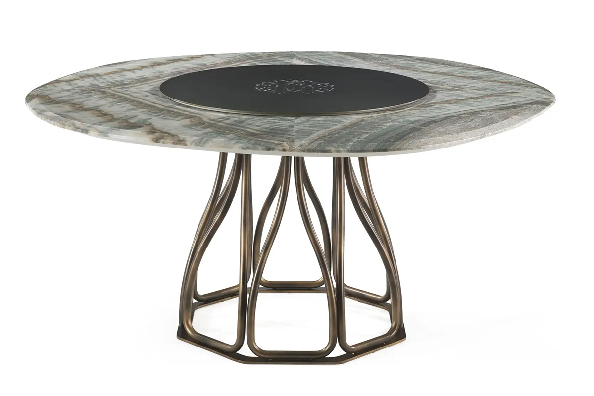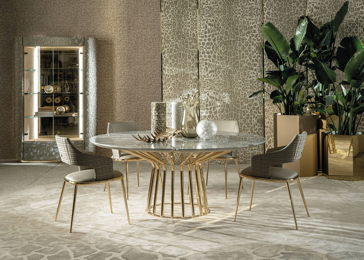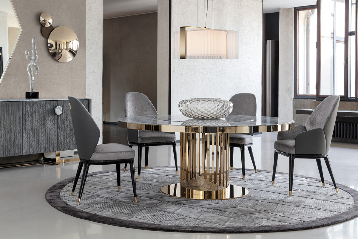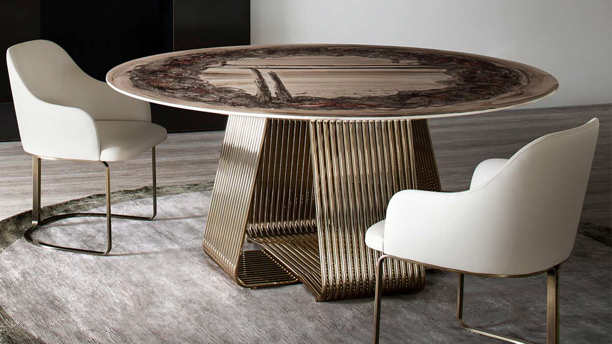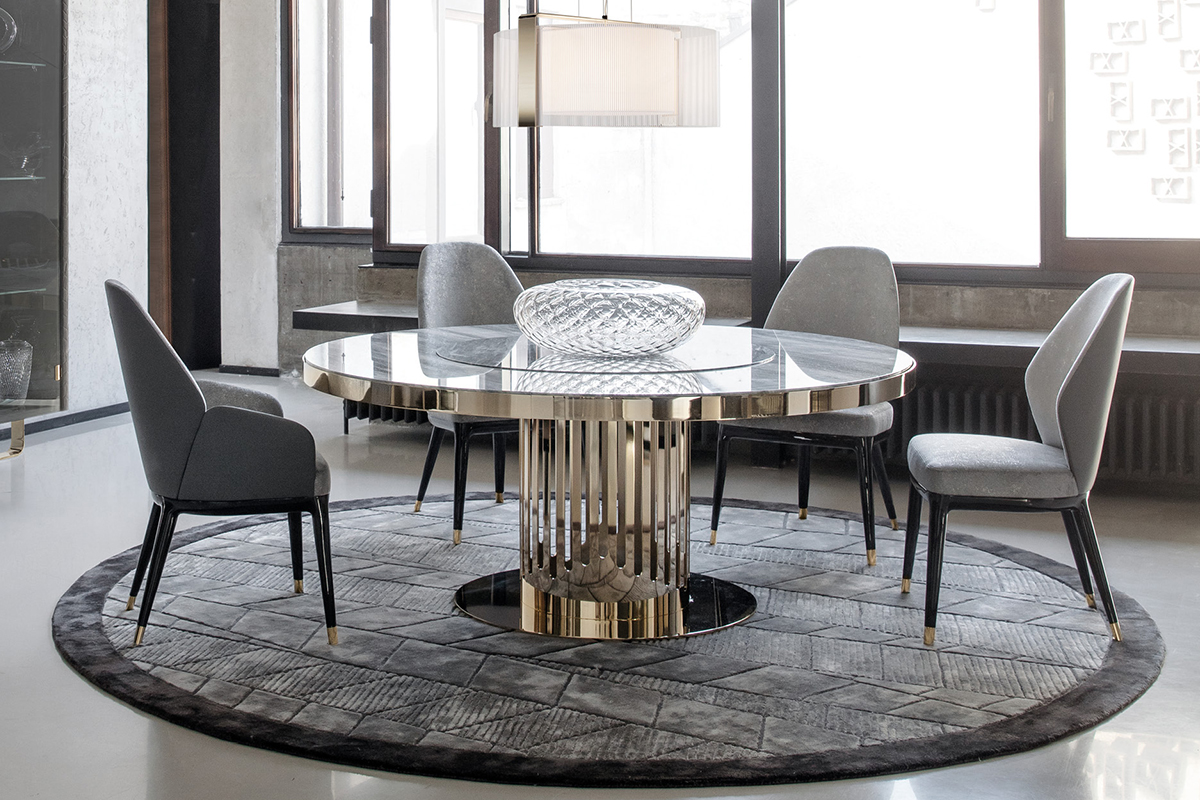 Круглый обеденный стол Charisma может показаться обманчиво простым: круглая столешница, цилиндрическое основание. Однако нерегулярный ритм прорезей основания добавляет динамики, а драгоценные материалы – мрамор и 24-каратное золото – игру текстур.