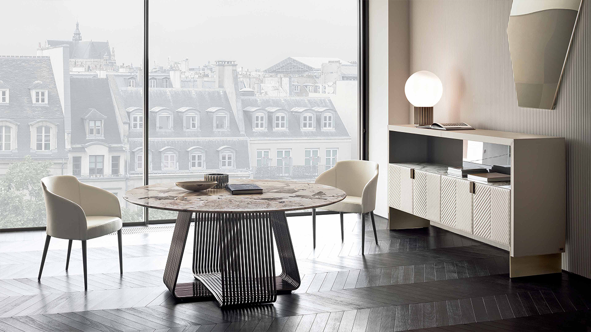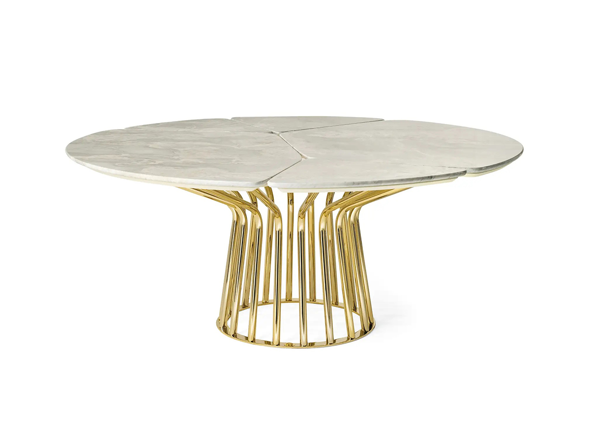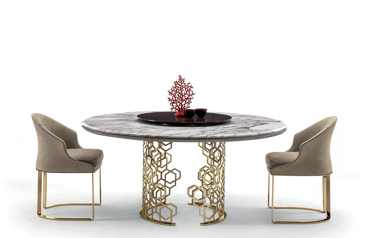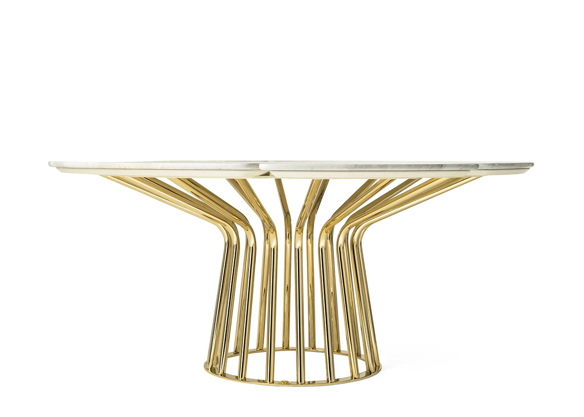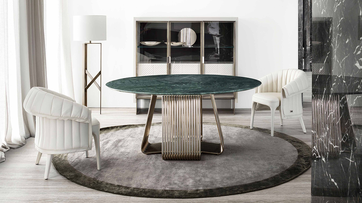 Круглый обеденный стол Charisma может показаться обманчиво простым: круглая столешница, цилиндрическое основание. Однако нерегулярный ритм прорезей основания добавляет динамики, а драгоценные материалы – мрамор и 24-каратное золото – игру текстур.