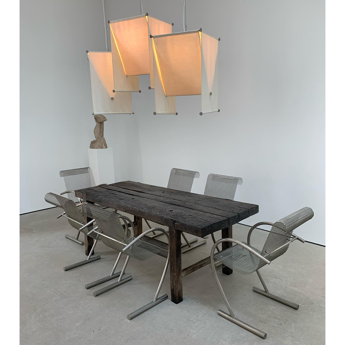 Кресло Galaxie, также известное как кресло Zig-Zag, – неповторимый дизайн французского архитектора и дизайнера Жака-Анри Варишона (1945 – 2011). Кресла, впервые представленные в 1969 году, были описаны их создателем как самоподвешивающиеся с помощью натяжных тросов. Компоненты каркаса не соприкасаются и не передают нагрузку друг другу, поэтому сидящей удерживается, словно в паутине, натянутой между ветвями.СТУЛЬЯ SOLID, 1986. ХАЙНЦ ЛЭНДИС