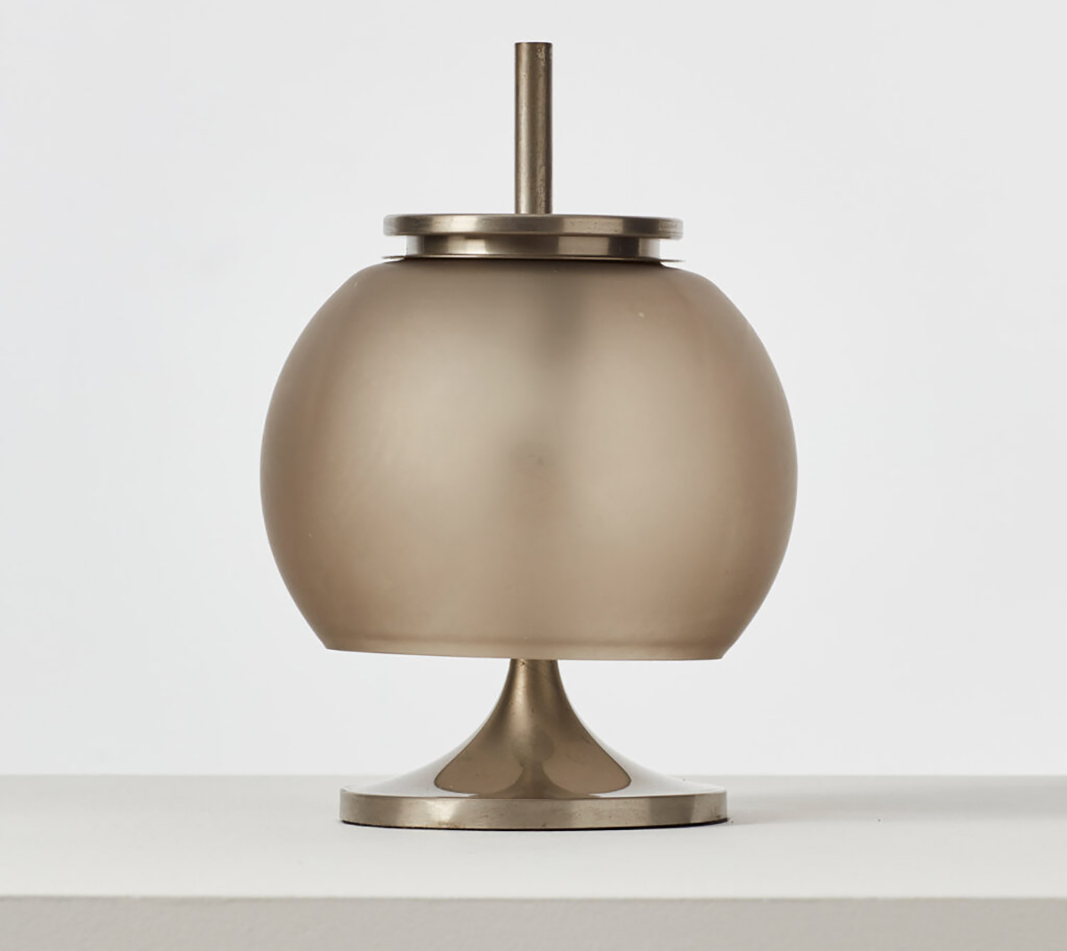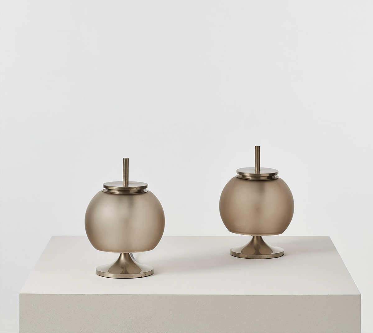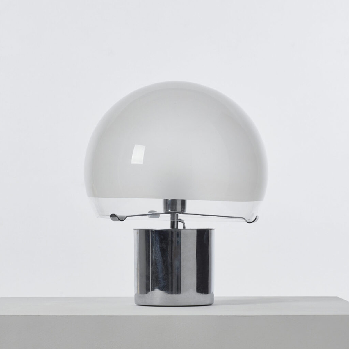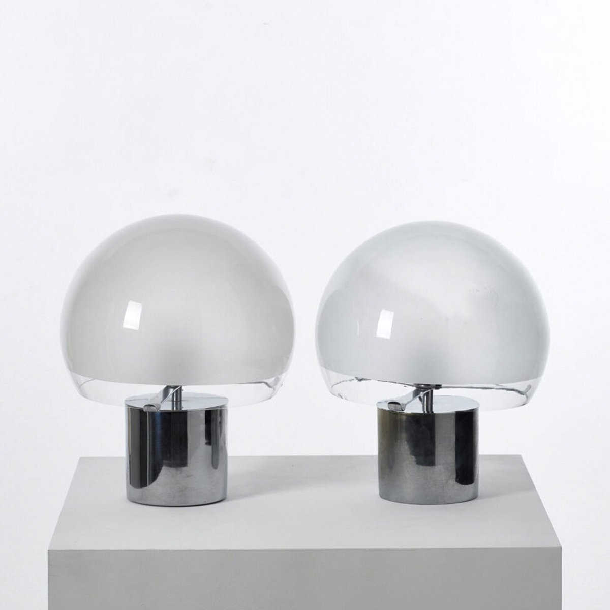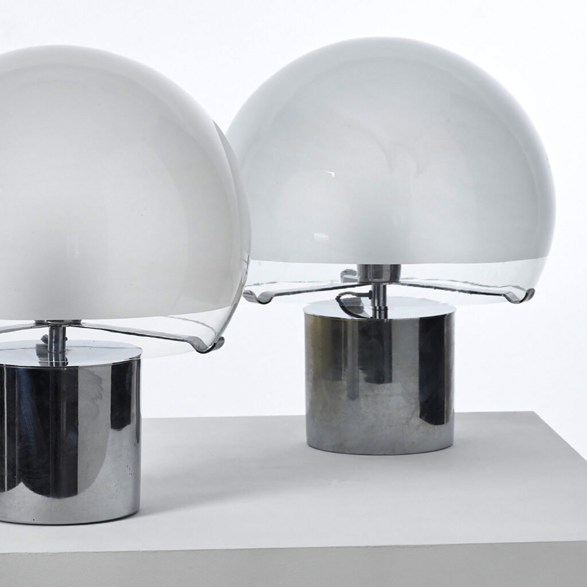 Элегантная пара стеклянных настольных ламп создана дизайнером Эммой Джизмонди Швайнбергер (1934 – 2019). Усеченная сфера диффузора нанизана на изящную металлическую конструкцию. Теплый свет лучится сквозь рассеиватель, отражаясь на изгибе основания.
