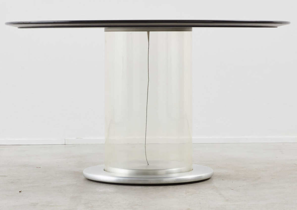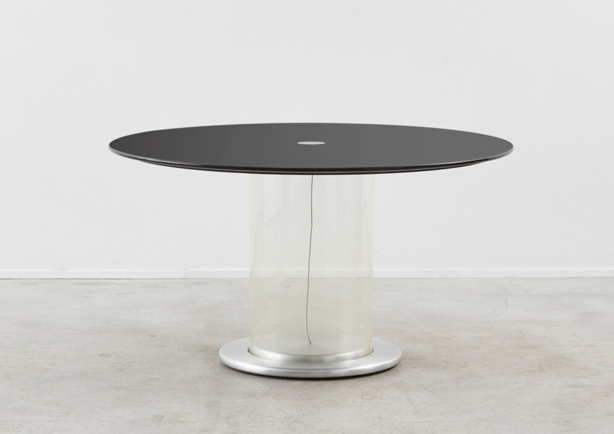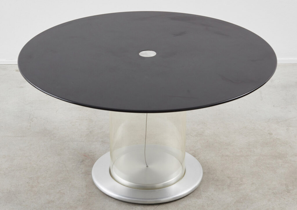 Обеденный стол Elisse выглядит футуристично за счет натянутой стальной проволоки, подвешенной в цилиндре из тонированного акрила, соединяющего диск черной лакированной столешницы и базы из матового алюминия.КРЕСЛО GALAXIE, STEINER, 1972. ЖАК-АНРИ ВАРИШОН