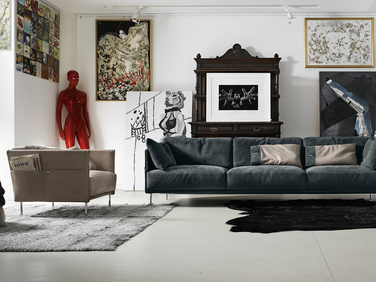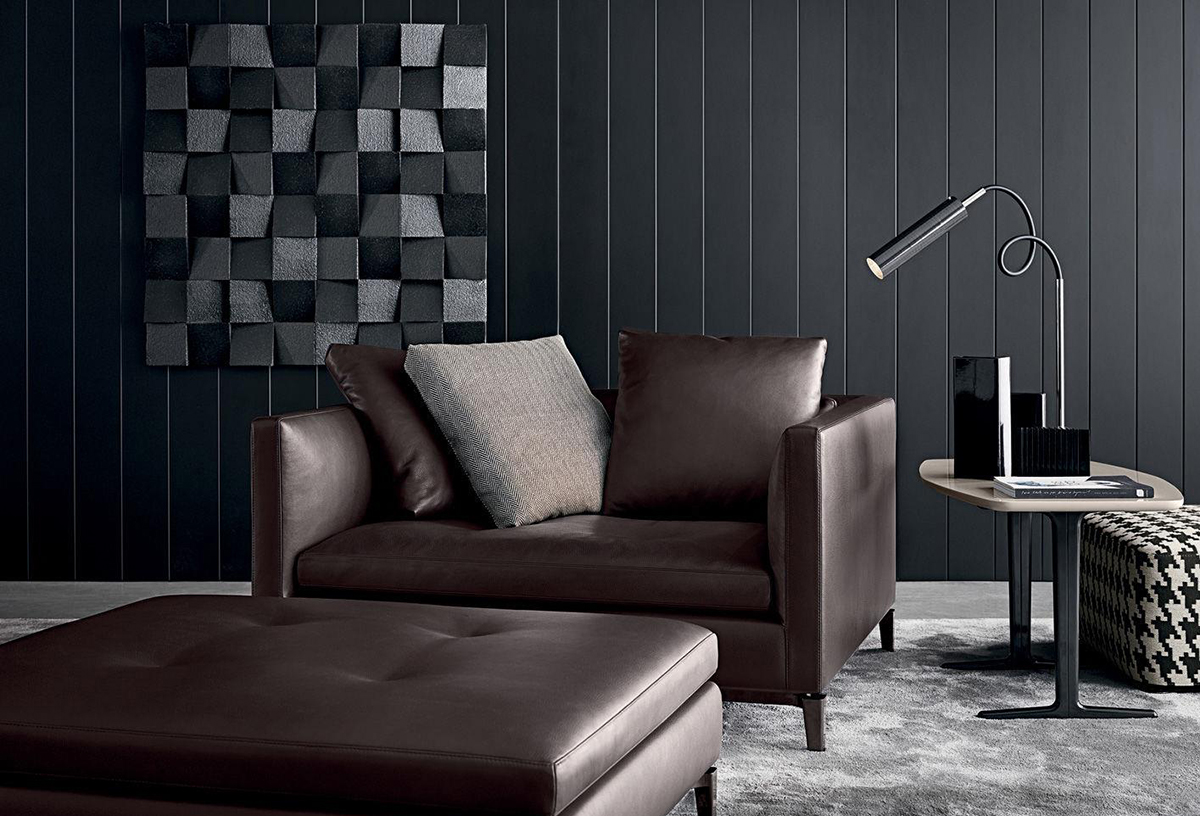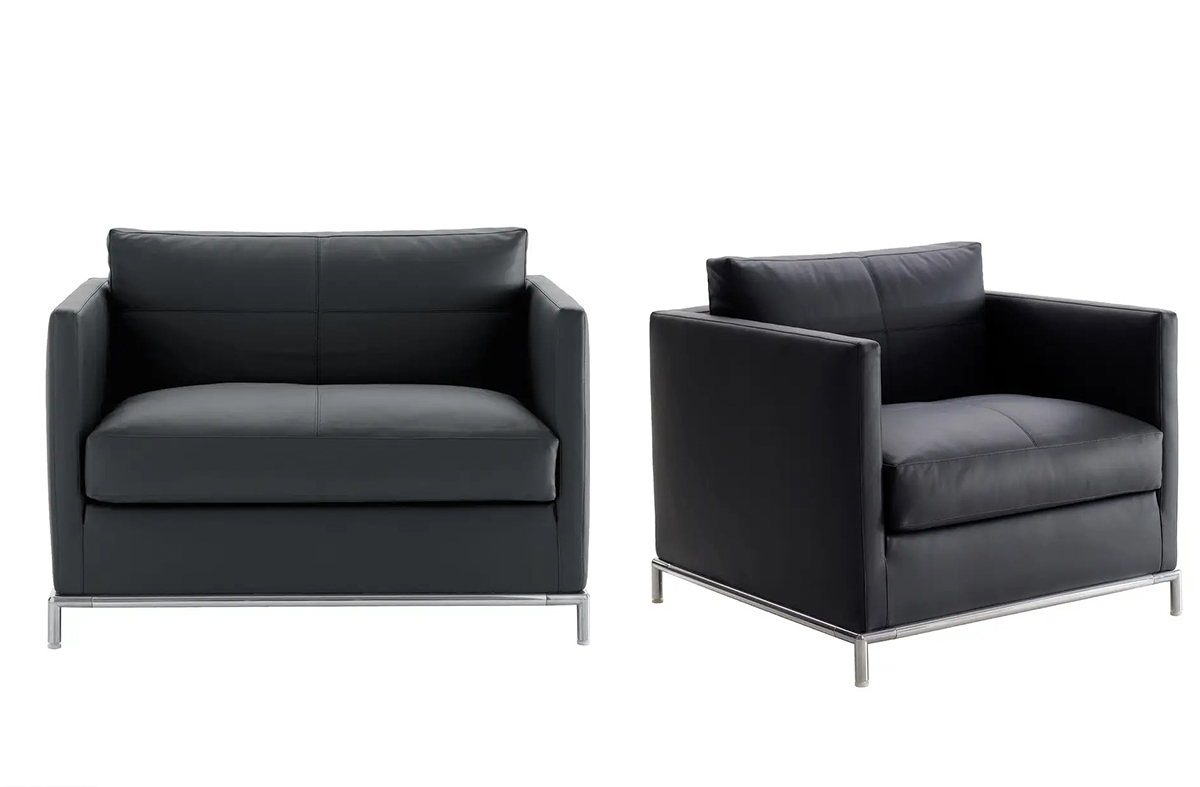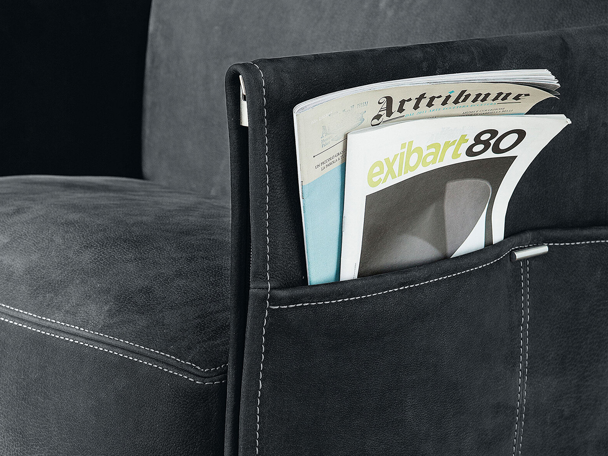 Единая высота подлокотников и спинки остался. Ортогональная форма смягчена плавными изгибами, которые подчеркивают мягкость натуральной кожи. Дополнительного объема придают аккуратные кармашки для журналов в боковинах подлокотников. Металлические ножки изящно приподнимают конструкцию и балансируют массивный верх.