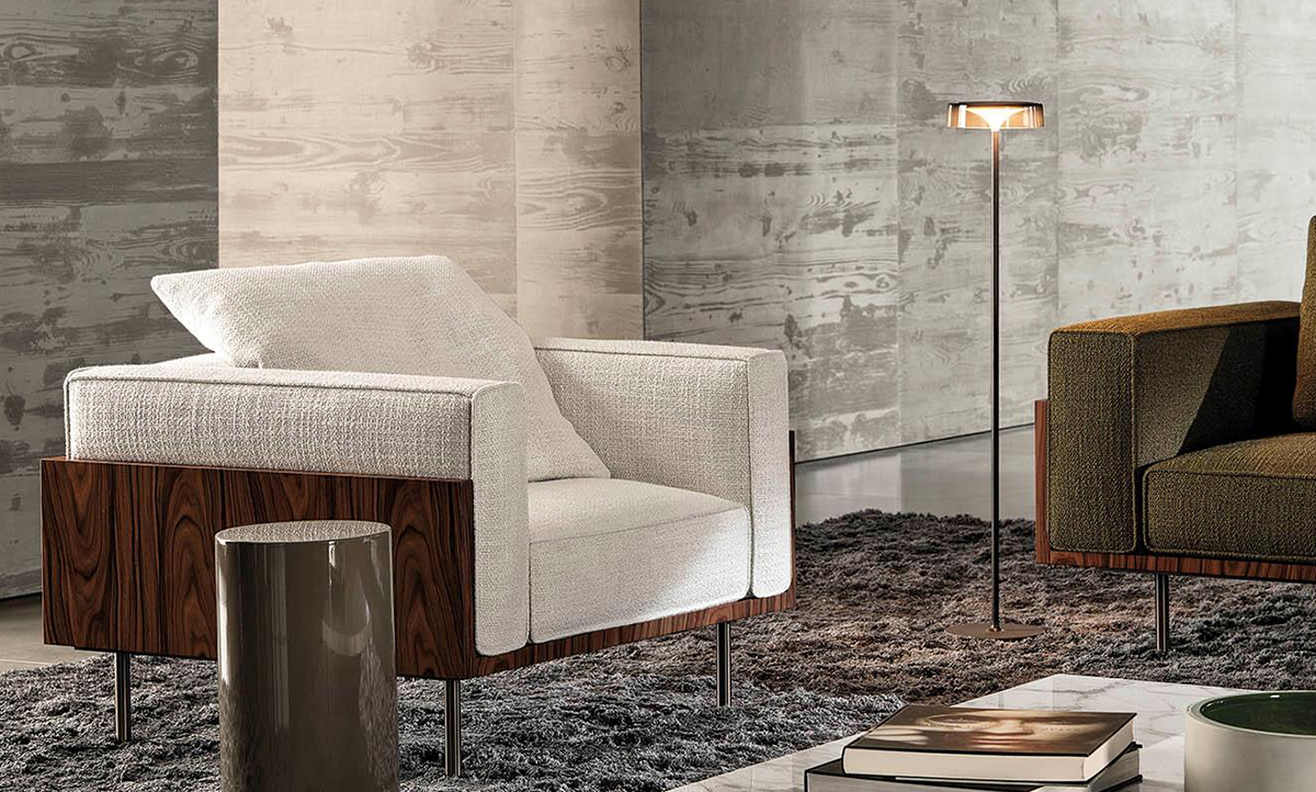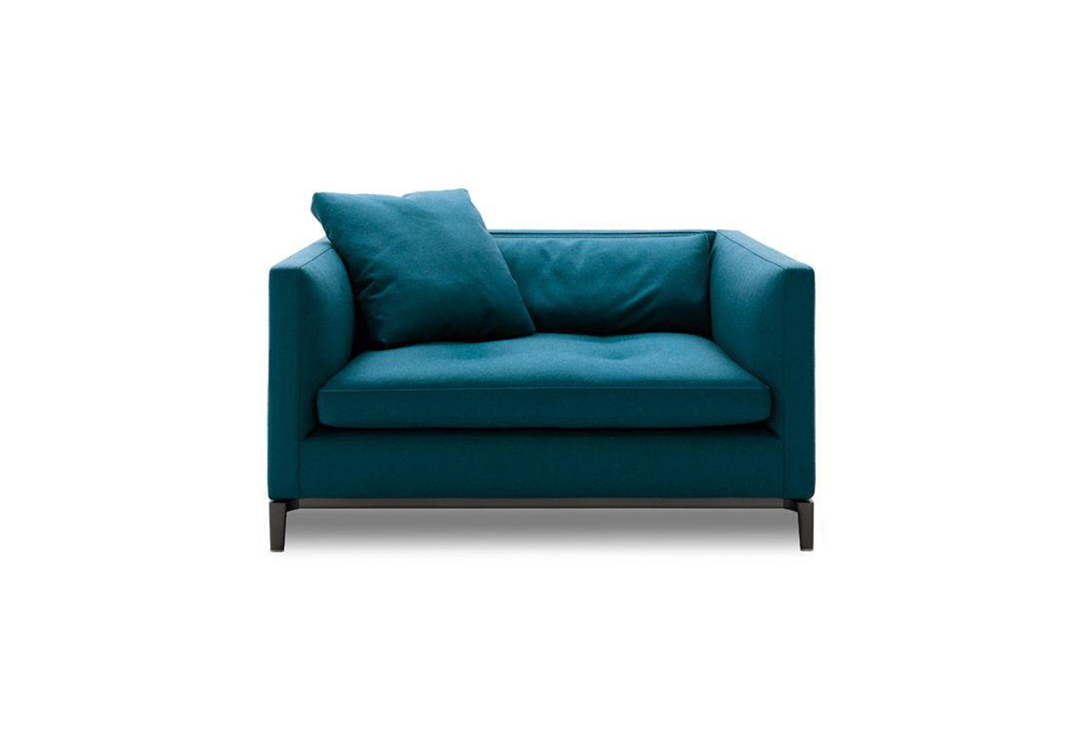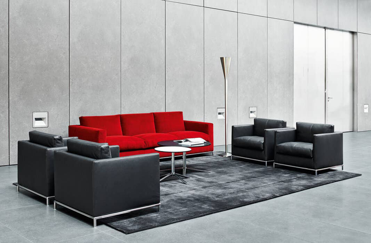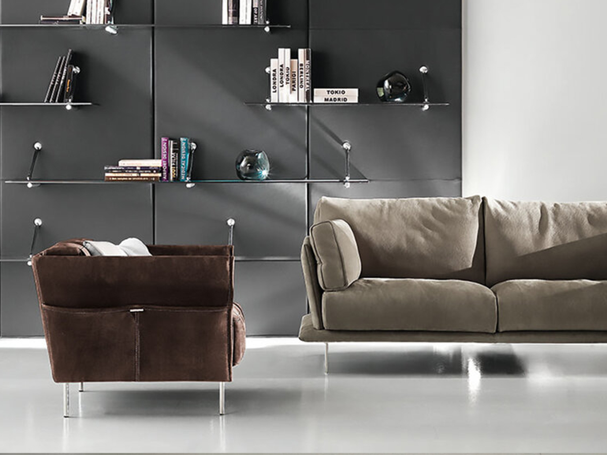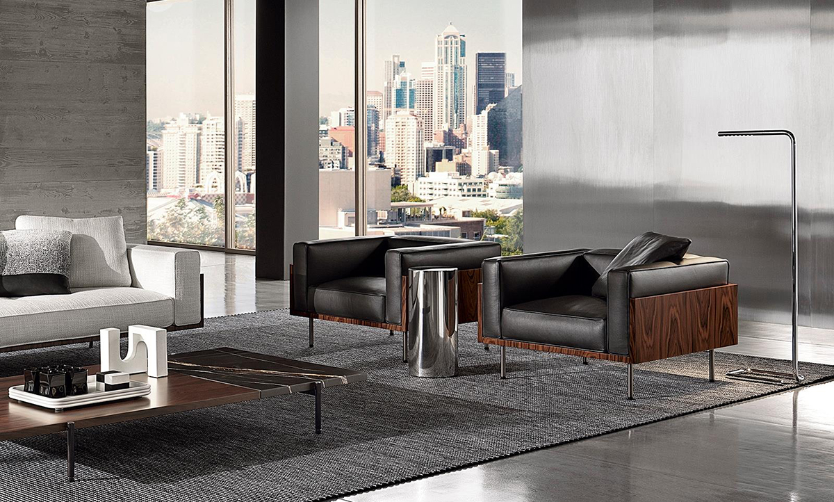 Единая высота подлокотников и спинки остался. Ортогональная форма смягчена плавными изгибами, которые подчеркивают мягкость натуральной кожи. Дополнительного объема придают аккуратные кармашки для журналов в боковинах подлокотников. Металлические ножки изящно приподнимают конструкцию и балансируют массивный верх.