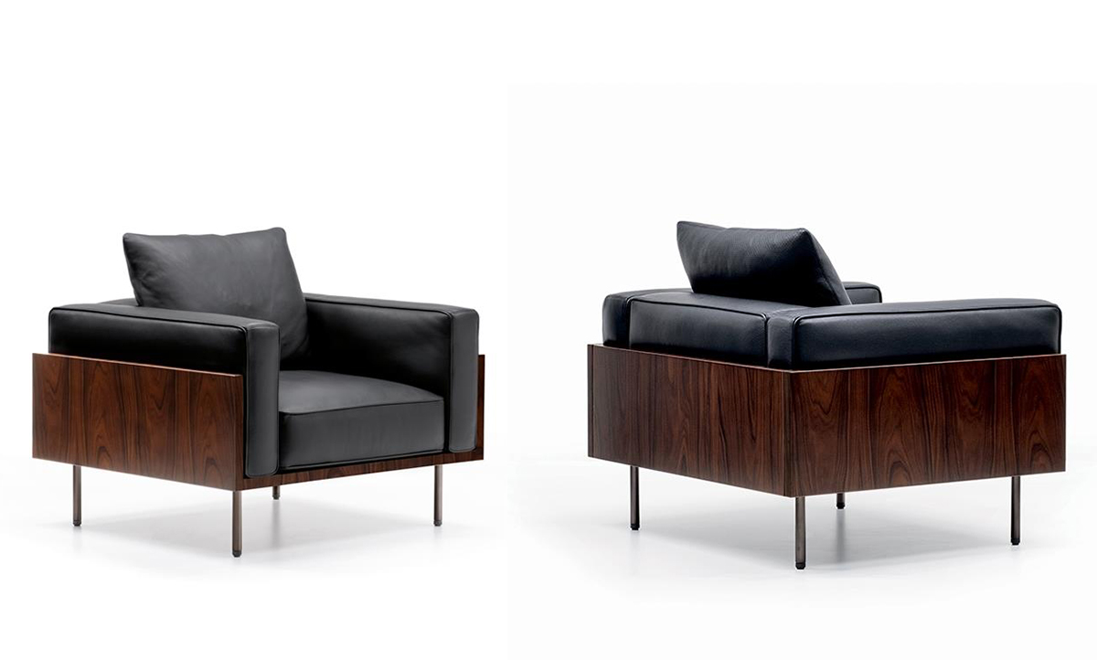 Контраст натуральной кожи и металла усиливается тонированным шпоном палисандра Сантос, примененным для облицовки внешней части подлокотника, что добавляет предмету экзотического звучания.
